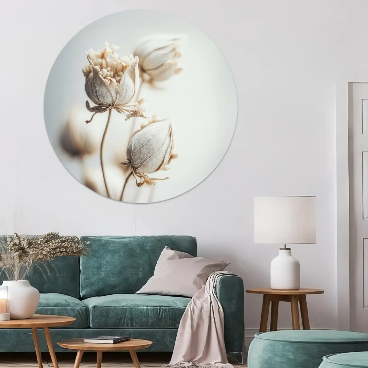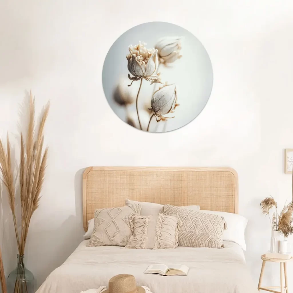 Deze wanddecoratie legt de schoonheid van een katoenbloem vast in zijn meest pure vorm. Dit kunstwerk eert de fijne elegantie van de natuur en voegt een gevoel van vernieuwing en rust toe aan uw omgeving. Laat dit kunstwerk fungeren als een herinnering aan de kleine wonderen die ons omringen.