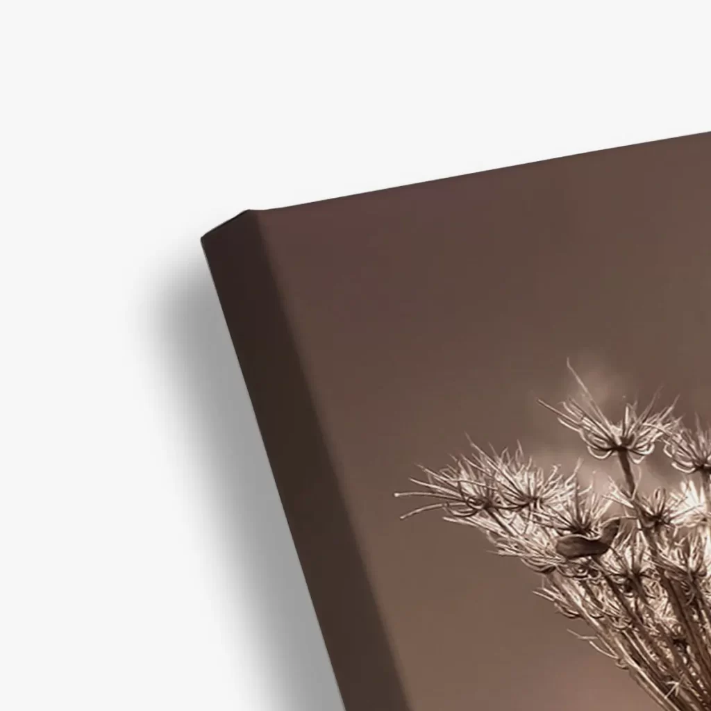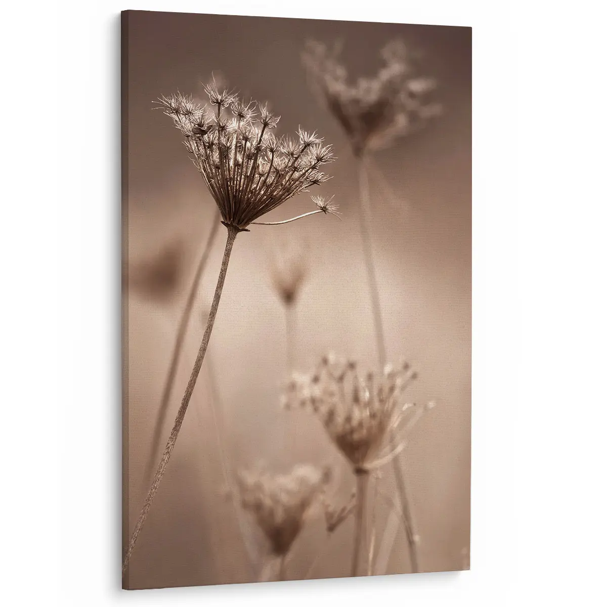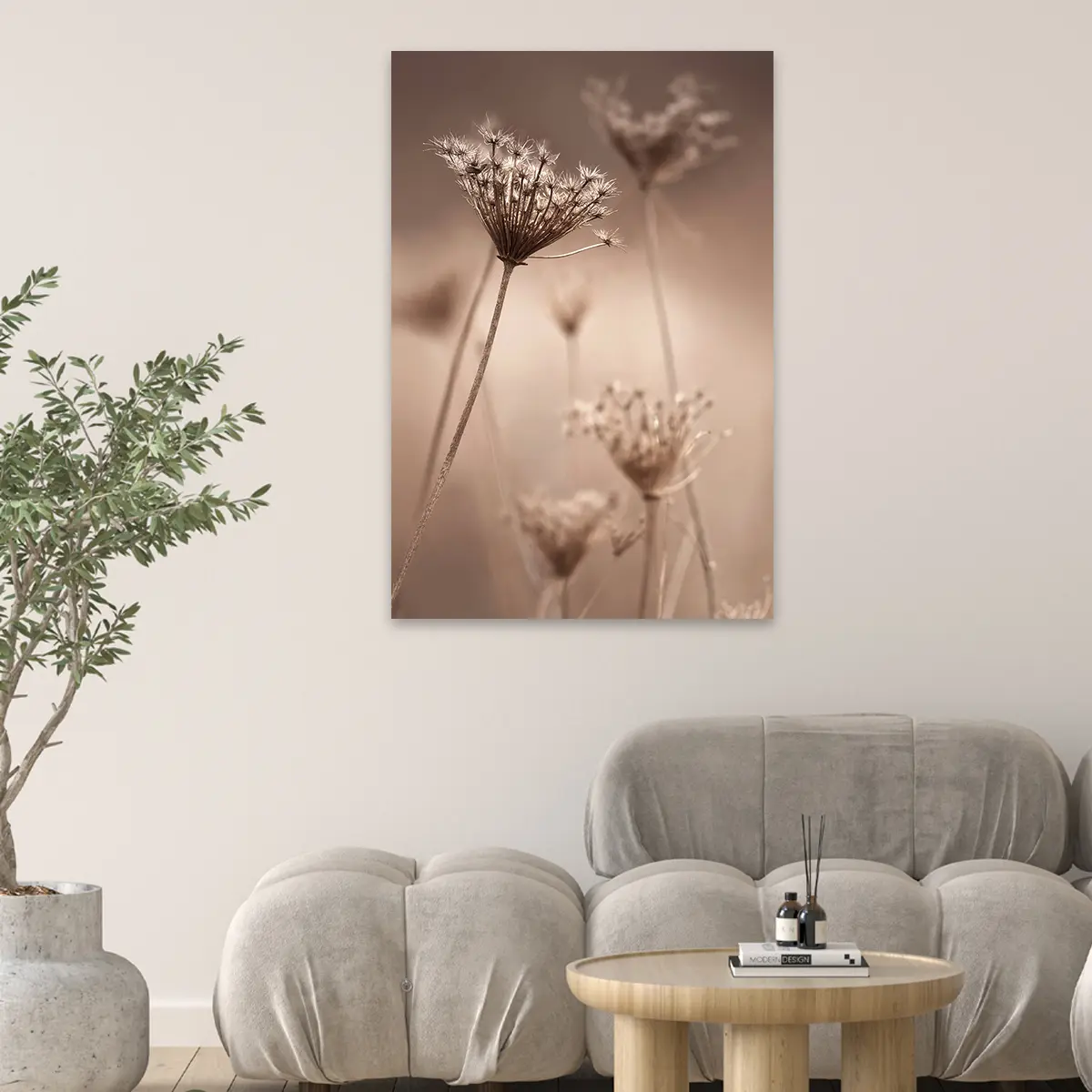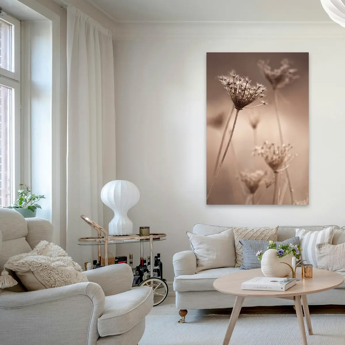 Een sfeervolle close-up van een uitgebloeide berenklauw in warme sepiatinten. De delicate structuur en het spel van licht maken deze botanische print tot een elegant kunstwerk. Als wanddecoratie brengt deze afbeelding een subtiele natuurlijke touch en tijdloze elegantie in elk interieur, perfect passend in een moderne of Scandinavische woonstijl.