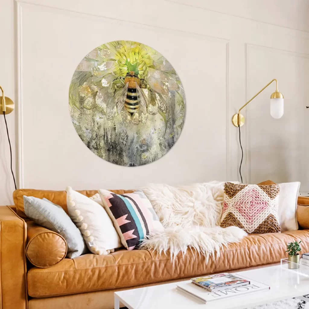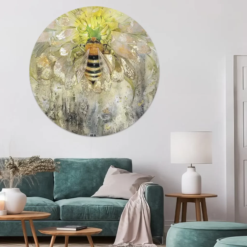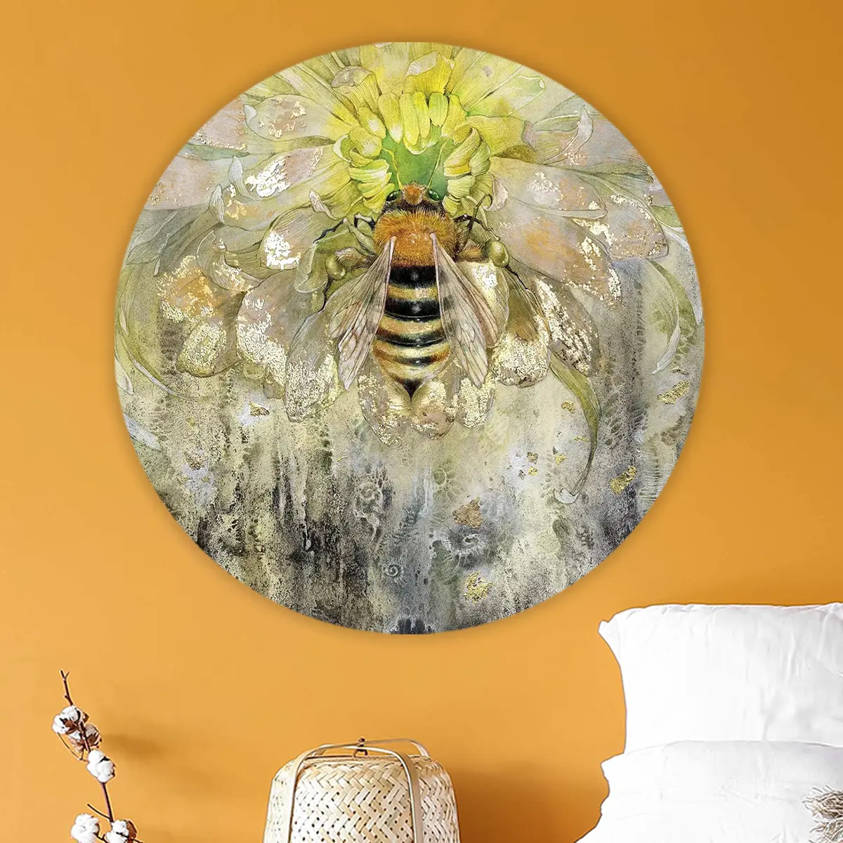 Een sfeervolle aquarel van een honingbij op een stralend gele bloem. De zachte, impressionistische stijl en de warme kleurtonen creëren een vriendelijke, natuurlijke sfeer. Als wanddecoratie brengt deze print een vleugje zomer en natuur in huis, perfect voor een botanisch of landelijk interieur. De gouden accenten geven het werk een luxueuze uitstraling.
