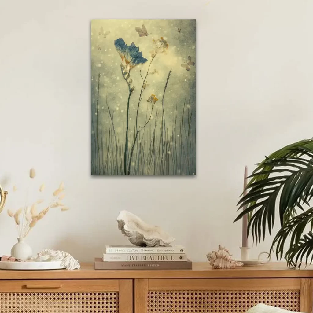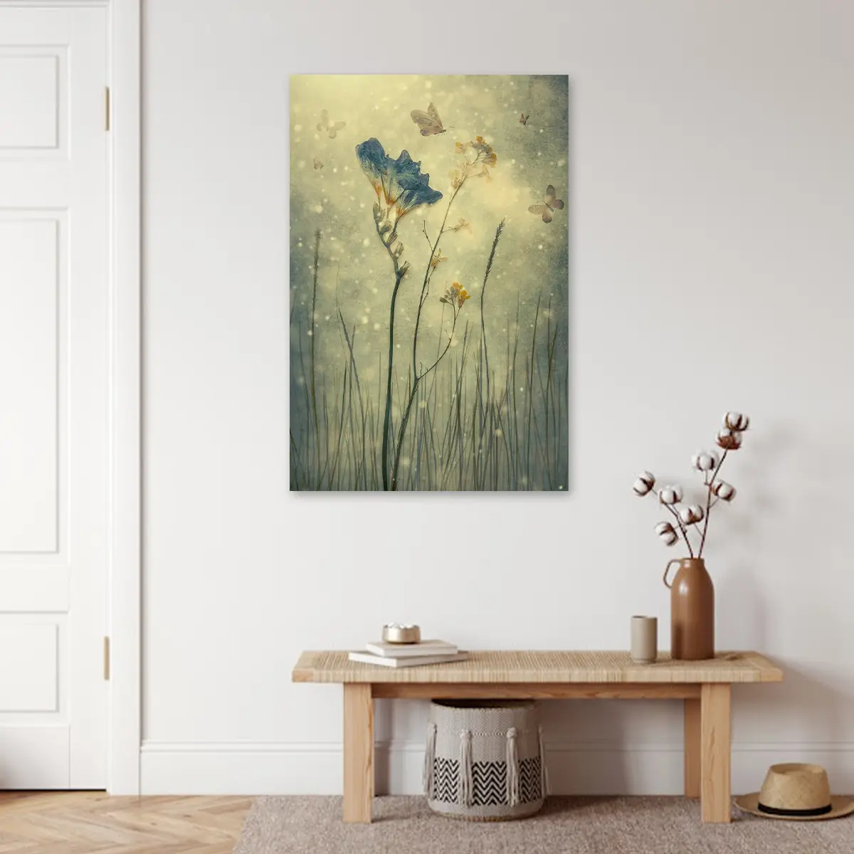 Een betoverend beeld van een blauwe bloem tegen een zacht, mistig decor met dansende vlinders en delicate wilde bloemen. De dromerige, vintage uitstraling en de zachte kleurschakeringen creëren een rustgevende sfeer die perfect past in een romantisch of landelijk interieur. De subtiele lichtpuntjes in de achtergrond geven het geheel een magische dimensie.