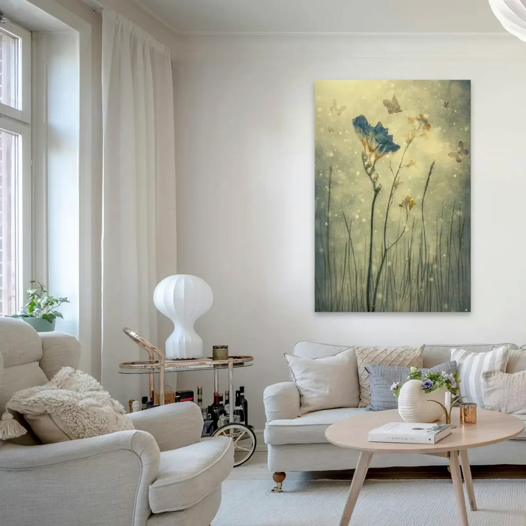 Een betoverend beeld van een blauwe bloem tegen een zacht, mistig decor met dansende vlinders en delicate wilde bloemen. De dromerige, vintage uitstraling en de zachte kleurschakeringen creëren een rustgevende sfeer die perfect past in een romantisch of landelijk interieur. De subtiele lichtpuntjes in de achtergrond geven het geheel een magische dimensie.