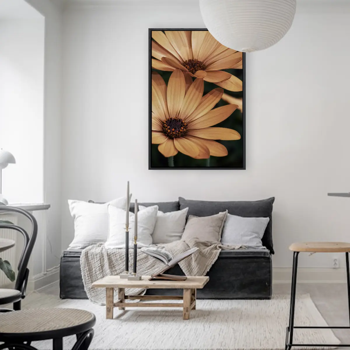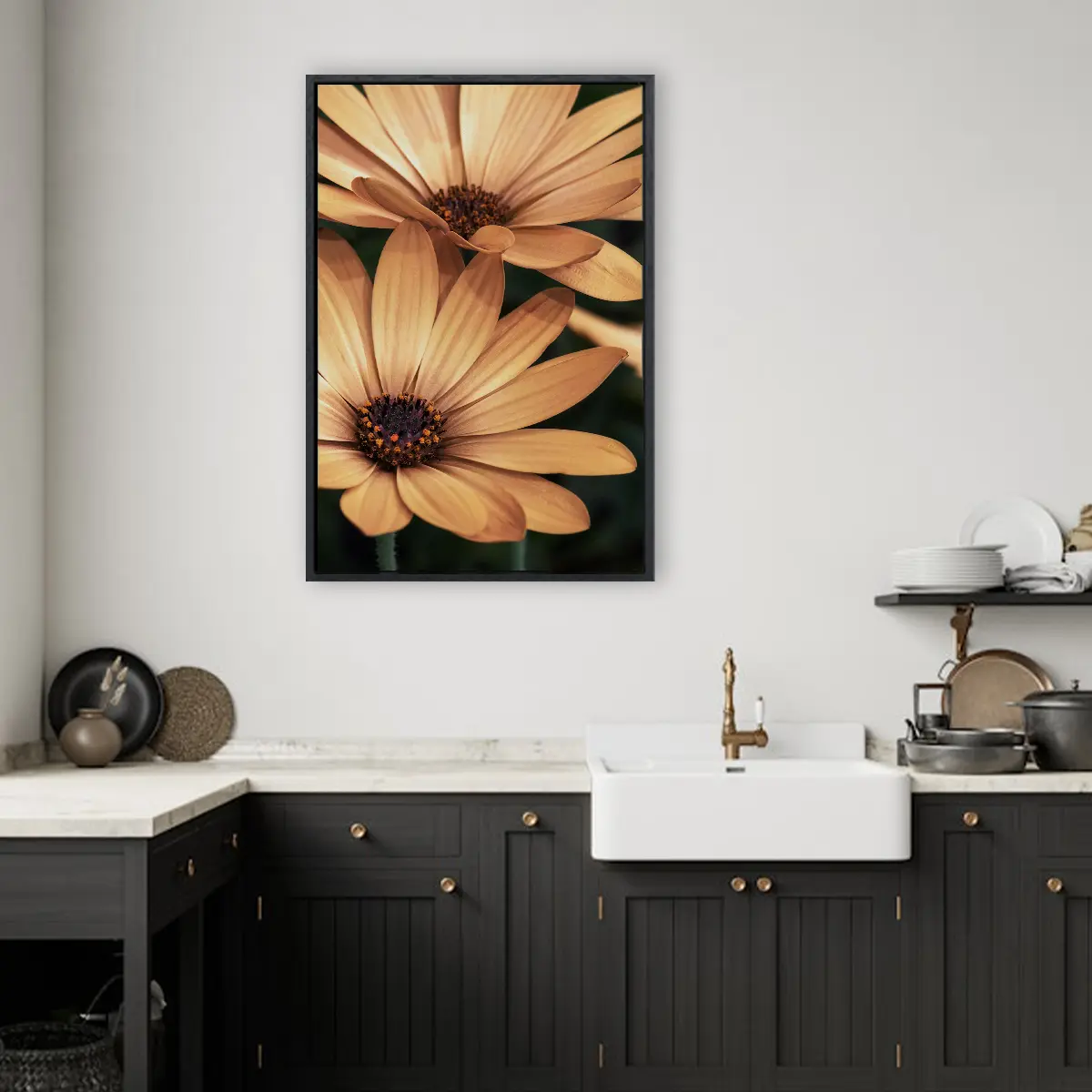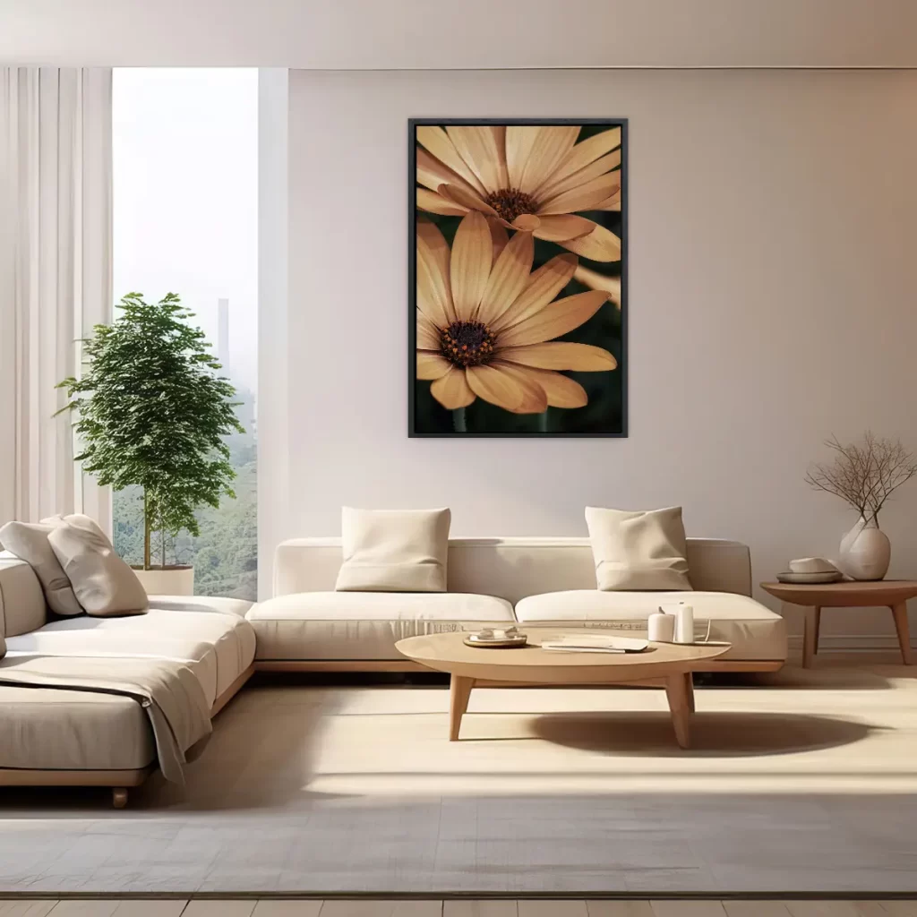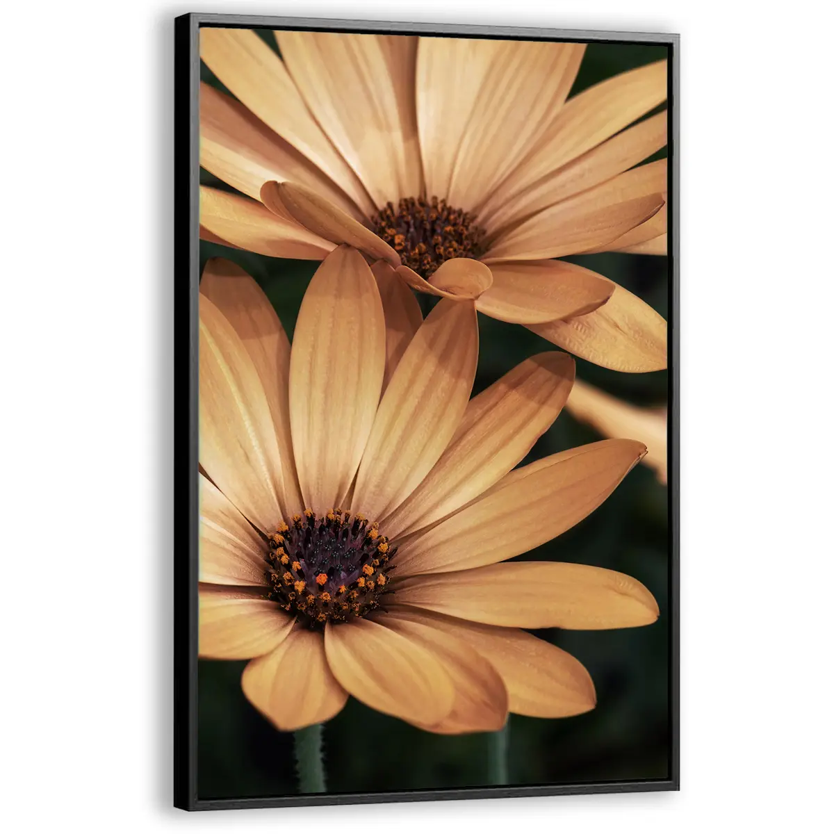 Een warme, intieme close-up van oranje madelieven die straalt van positieve energie. De rijke, honinggouden tinten en de scherpe details van de bloemblaadjes creëren een krachtig beeld dat warmte en levendigheid toevoegt aan elke ruimte. Perfect voor een modern of botanisch geïnspireerd interieur.