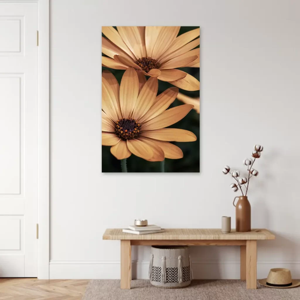 Een warme, intieme close-up van oranje madelieven die straalt van positieve energie. De rijke, honinggouden tinten en de scherpe details van de bloemblaadjes creëren een krachtig beeld dat warmte en levendigheid toevoegt aan elke ruimte. Perfect voor een modern of botanisch geïnspireerd interieur.
