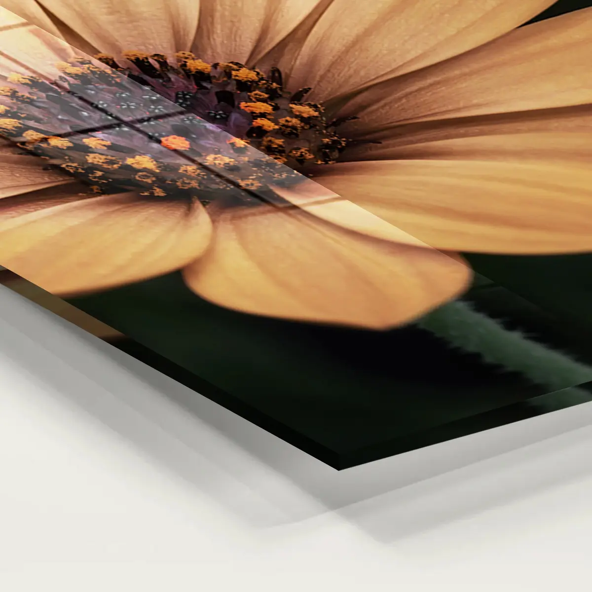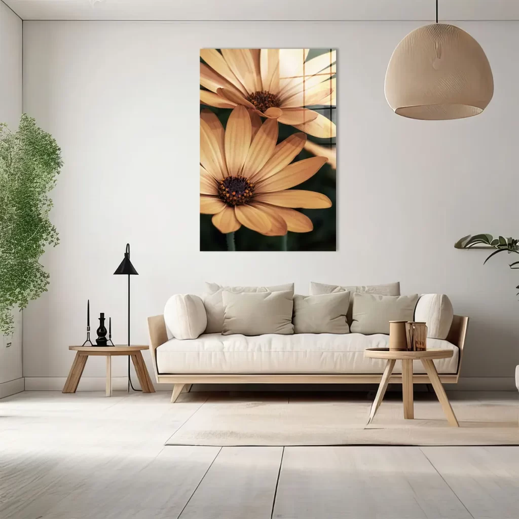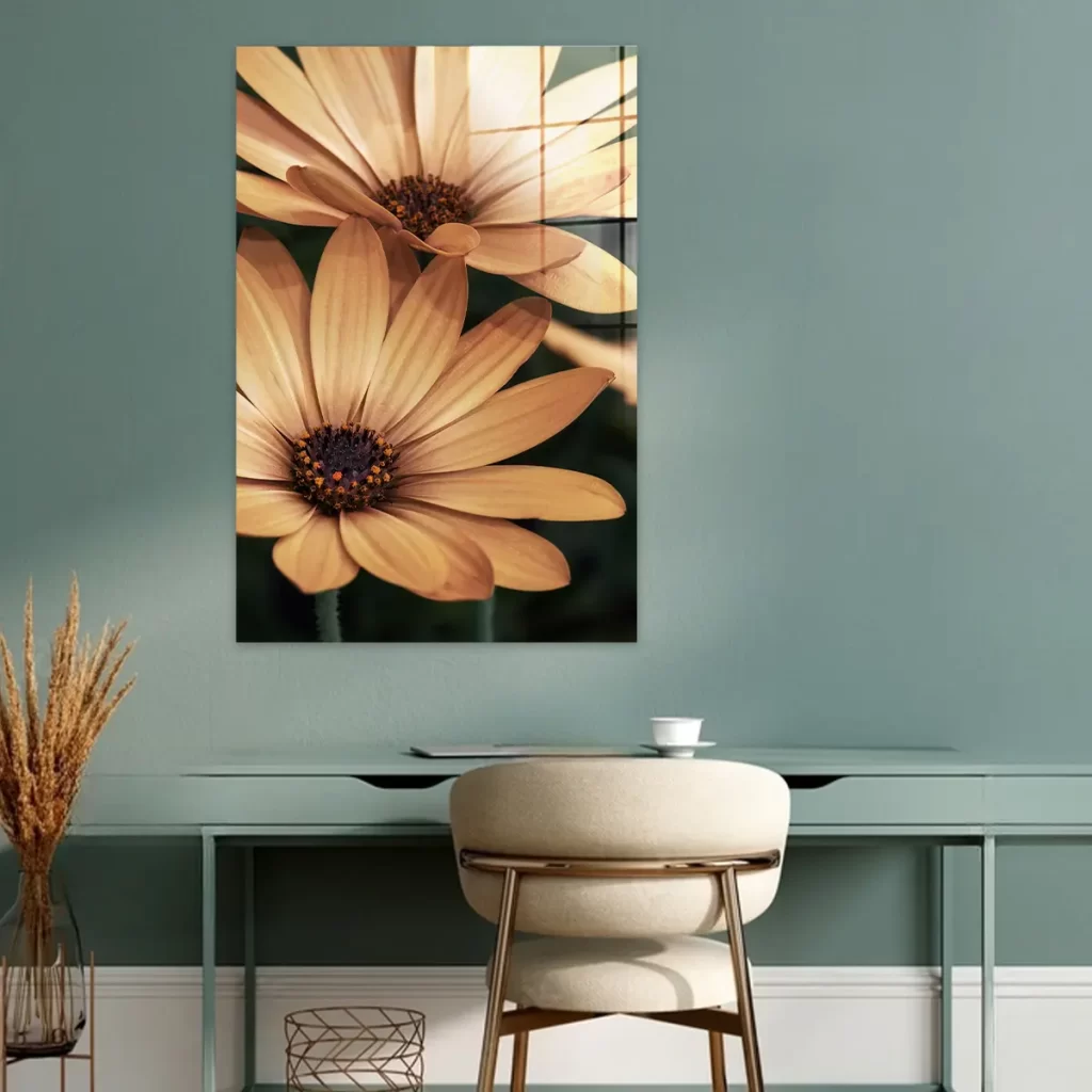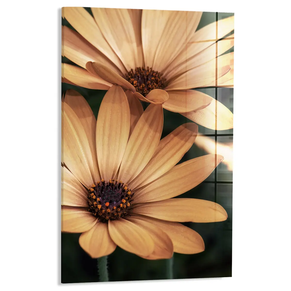 Een warme, intieme close-up van oranje madelieven die straalt van positieve energie. De rijke, honinggouden tinten en de scherpe details van de bloemblaadjes creëren een krachtig beeld dat warmte en levendigheid toevoegt aan elke ruimte. Perfect voor een modern of botanisch geïnspireerd interieur.