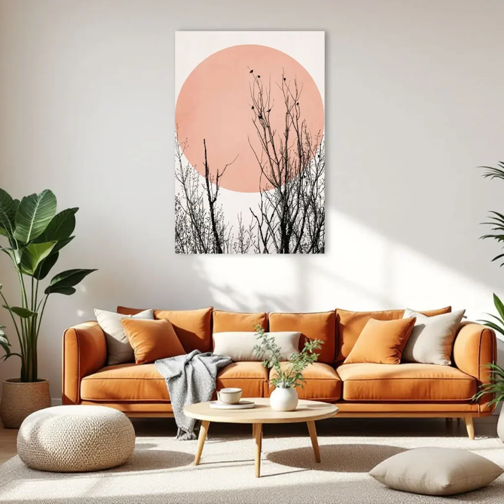 Een artistieke compositie van silhouet takken tegen een grote roze zon op een neutrale achtergrond. De contrast tussen de donkere, gedetailleerde takken en de zachte roze cirkel creëert een krachtig maar rustgevend beeld. Deze print voegt een moderne, minimalistische touch toe aan elk interieur en past perfect in een eigentijdse of Japans geïnspireerde woonstijl.