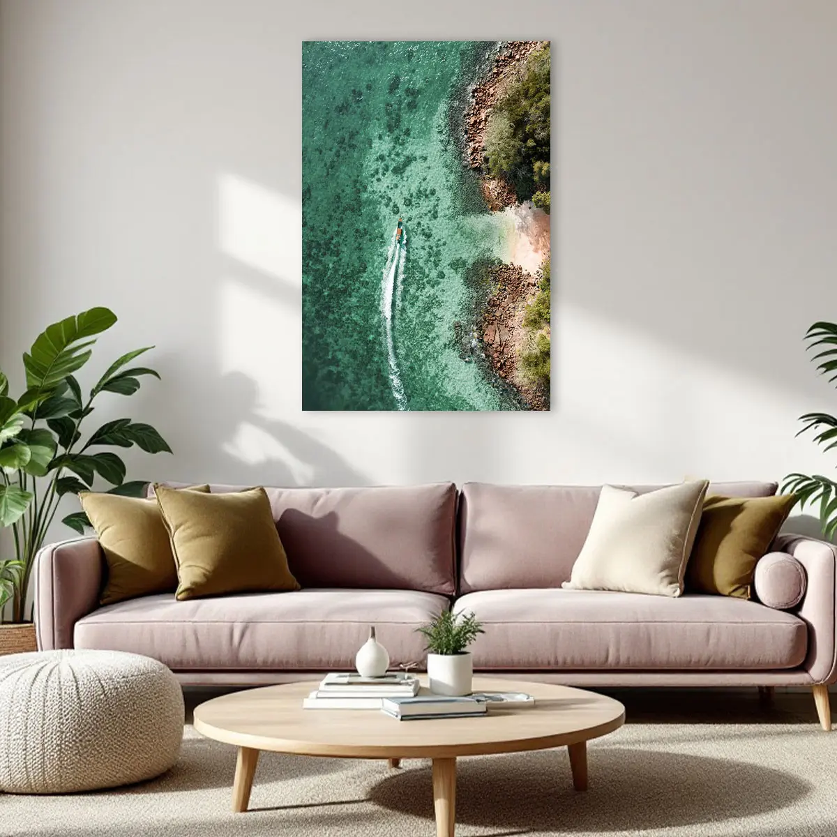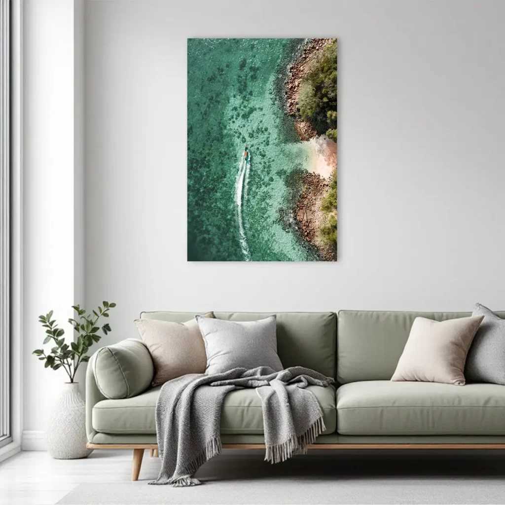 Een spectaculaire luchtfoto van een boot die door turquoise water vaart langs een rotsachtige kustlijn. Het contrast tussen het heldere water, de ruige rotsen en de weelderige groene vegetatie creëert een adembenemend tropisch tafereel. Deze print brengt direct vakantiegevoel en een gevoel van vrijheid in huis, perfect voor een modern of kustgeïnspireerd interieur.