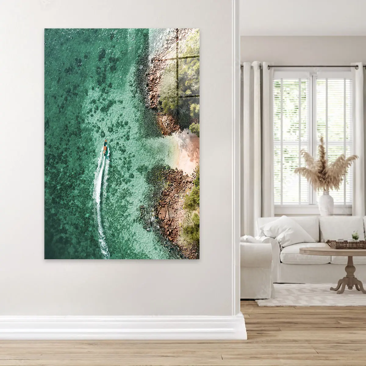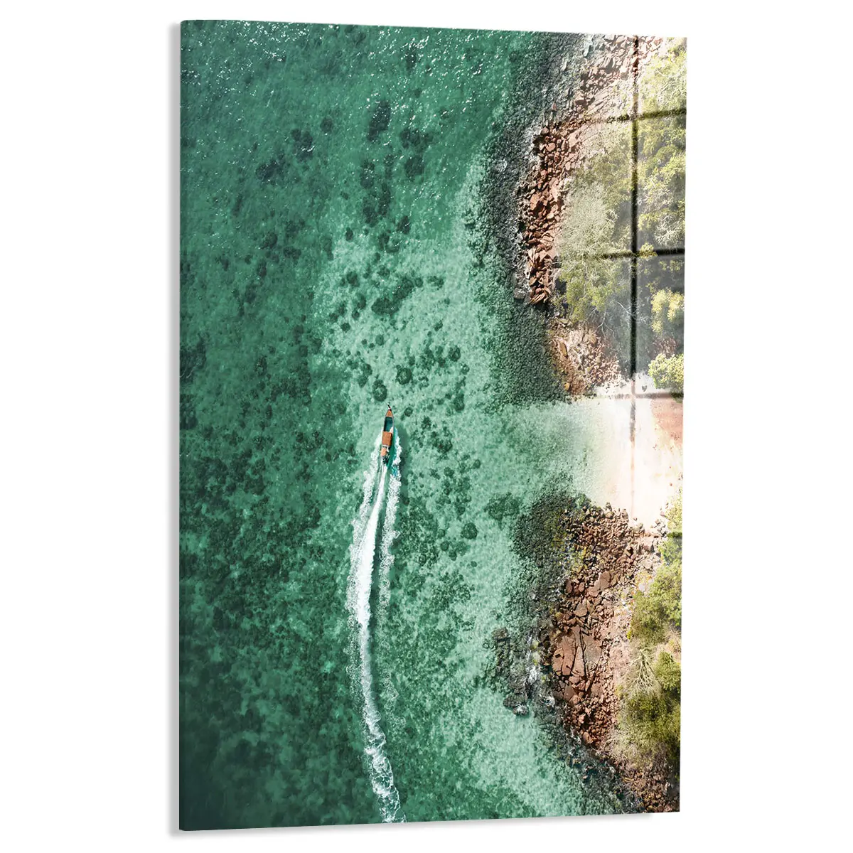 Een spectaculaire luchtfoto van een boot die door turquoise water vaart langs een rotsachtige kustlijn. Het contrast tussen het heldere water, de ruige rotsen en de weelderige groene vegetatie creëert een adembenemend tropisch tafereel. Deze print brengt direct vakantiegevoel en een gevoel van vrijheid in huis, perfect voor een modern of kustgeïnspireerd interieur.