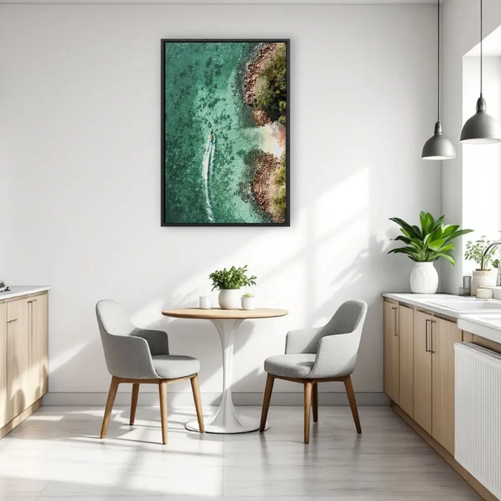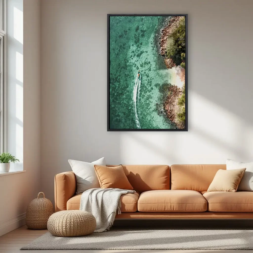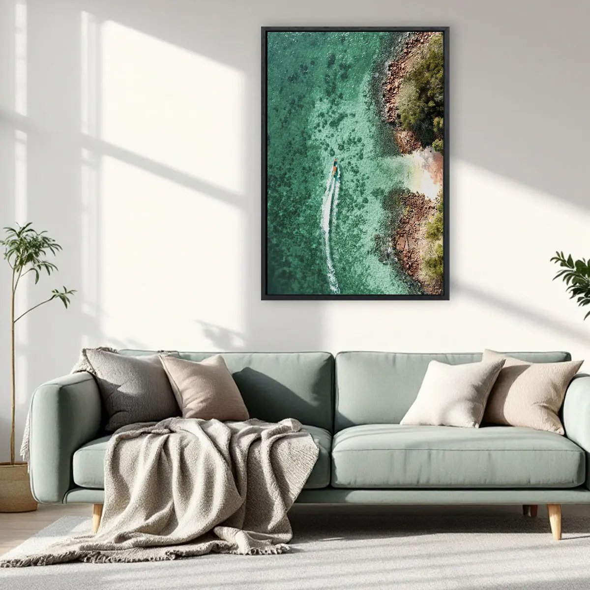 Een spectaculaire luchtfoto van een boot die door turquoise water vaart langs een rotsachtige kustlijn. Het contrast tussen het heldere water, de ruige rotsen en de weelderige groene vegetatie creëert een adembenemend tropisch tafereel. Deze print brengt direct vakantiegevoel en een gevoel van vrijheid in huis, perfect voor een modern of kustgeïnspireerd interieur.