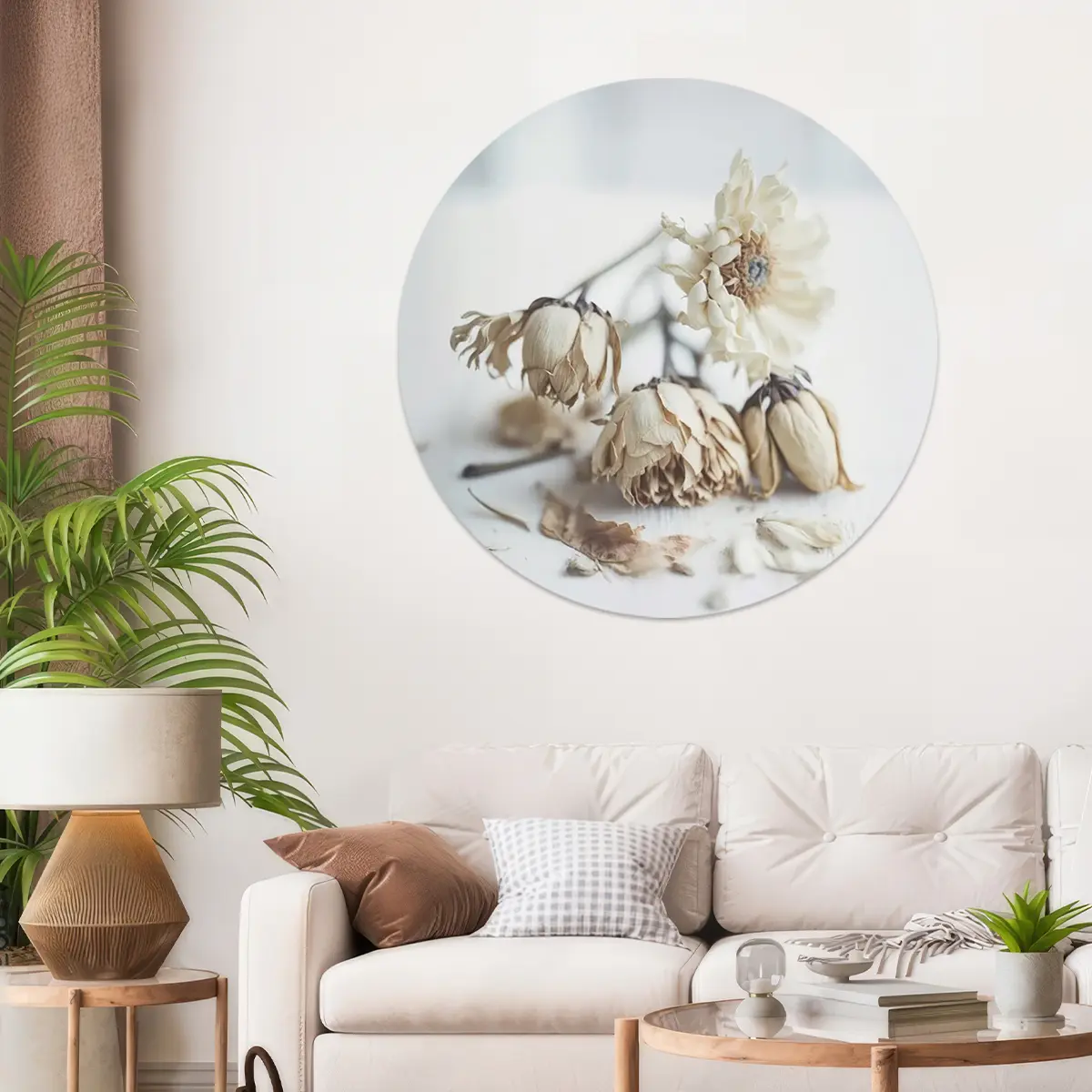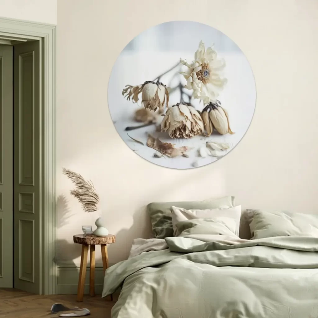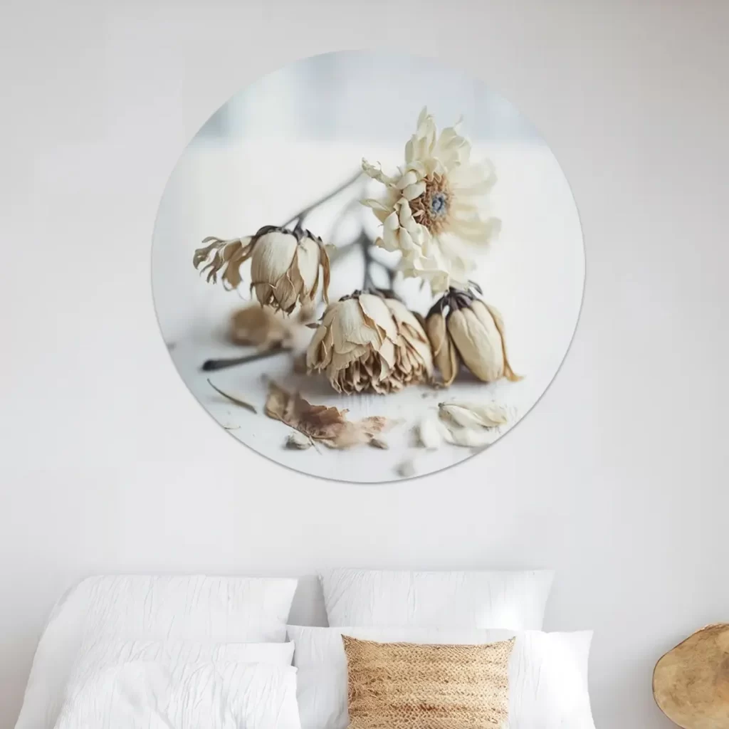 Deze artistieke compositie van uitgedroogde bloemen vertelt een verhaal van tijdloze elegantie. De zachte sepia tinten en de delicate texturen van de verwelkte bloemen creëren een sfeervolle, rustgevende wanddecoratie die perfect past in een minimalistisch of vintage interieur.
