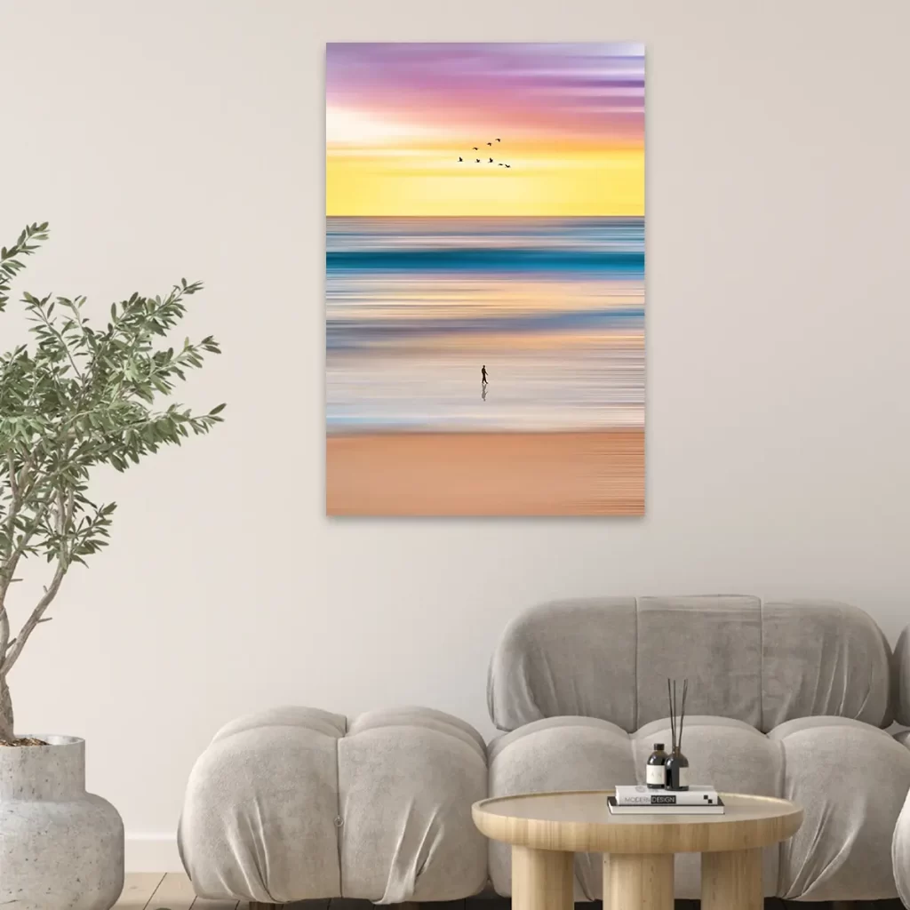 Een artistieke interpretatie van een strandwandeling, waarbij beweging en kleur samensmelten in een dromerige compositie.