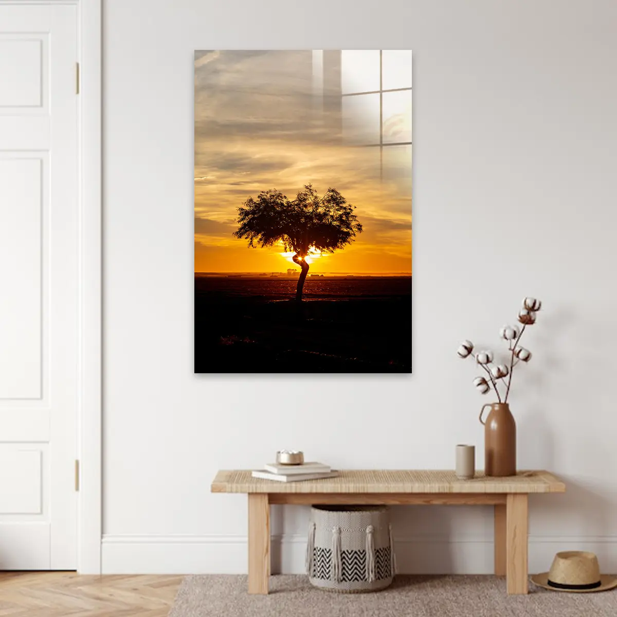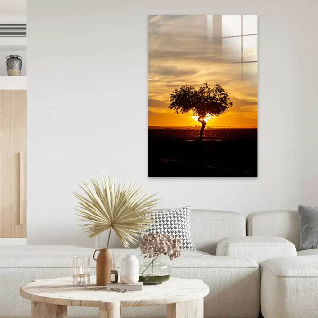 Een adembenemende zonsondergang met een solitaire boom als silhouet tegen de dramatische gouden hemel. De warme oranje en gele tinten van de lucht creëren een krachtige, emotionele sfeer die rust en contemplatie oproept. Als wanddecoratie brengt deze print een gevoel van sereniteit en natuurlijke schoonheid in elk interieur, perfect voor ruimtes waar je een moment van stilte en bezinning wilt creëren.