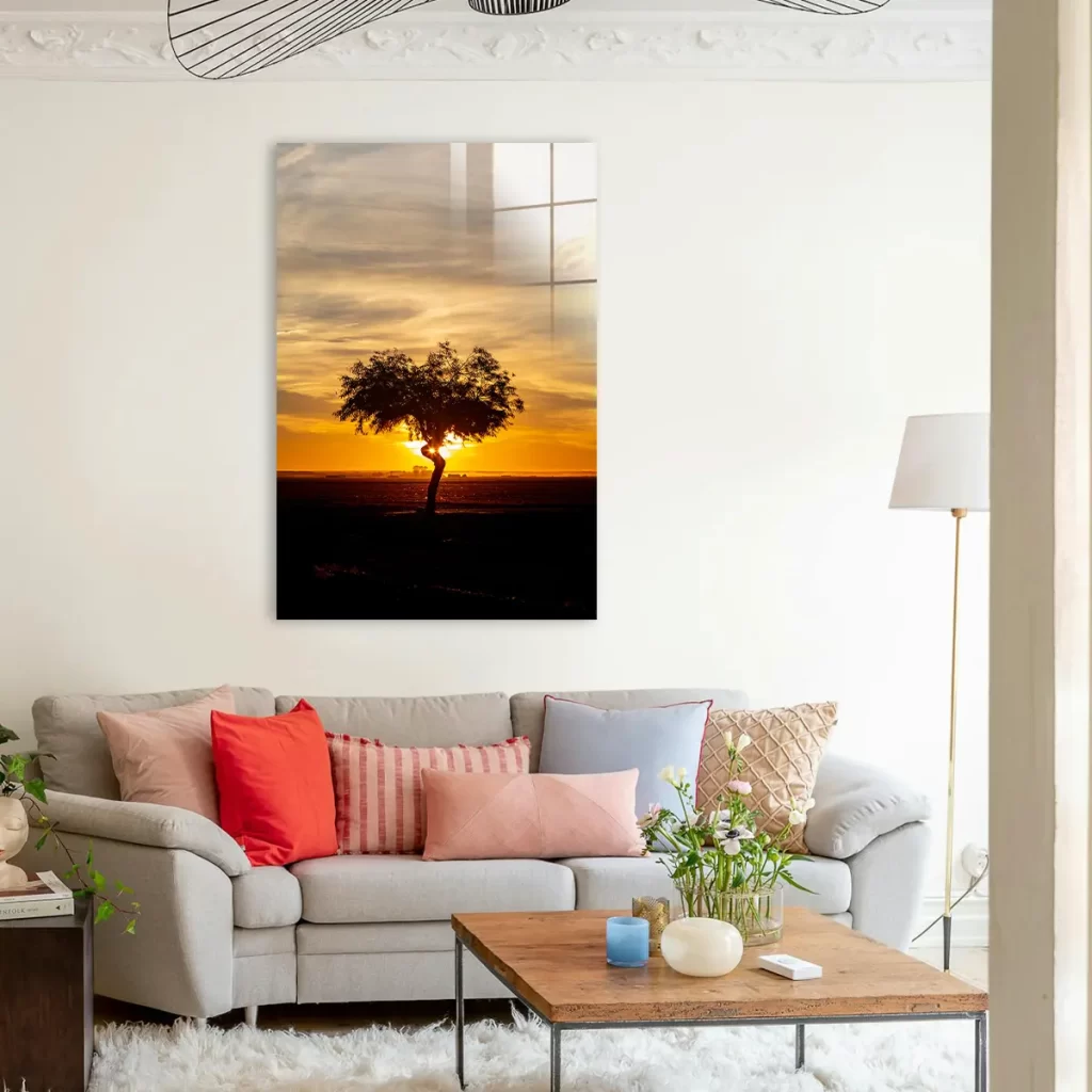 Het schilderij op glas heeft een moderne look en past goed in mijn interieur. Tevreden met mijn aankoop.