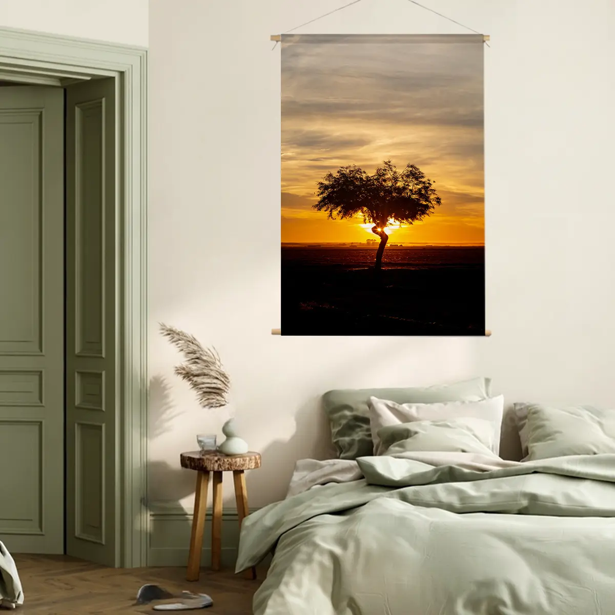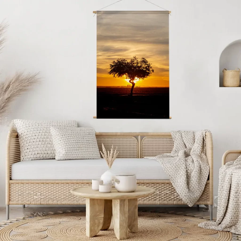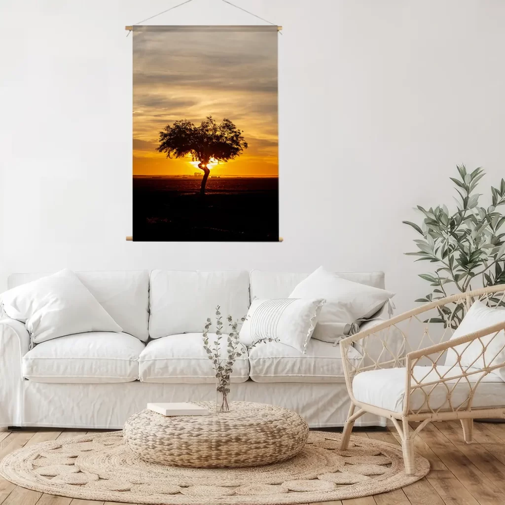 Een adembenemende zonsondergang met een solitaire boom als silhouet tegen de dramatische gouden hemel. De warme oranje en gele tinten van de lucht creëren een krachtige, emotionele sfeer die rust en contemplatie oproept. Als wanddecoratie brengt deze print een gevoel van sereniteit en natuurlijke schoonheid in elk interieur, perfect voor ruimtes waar je een moment van stilte en bezinning wilt creëren.