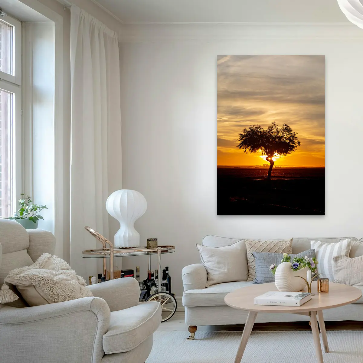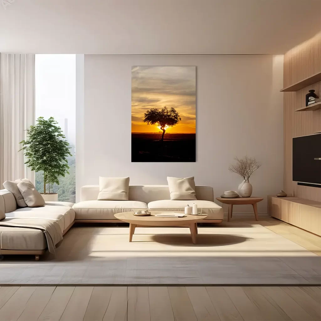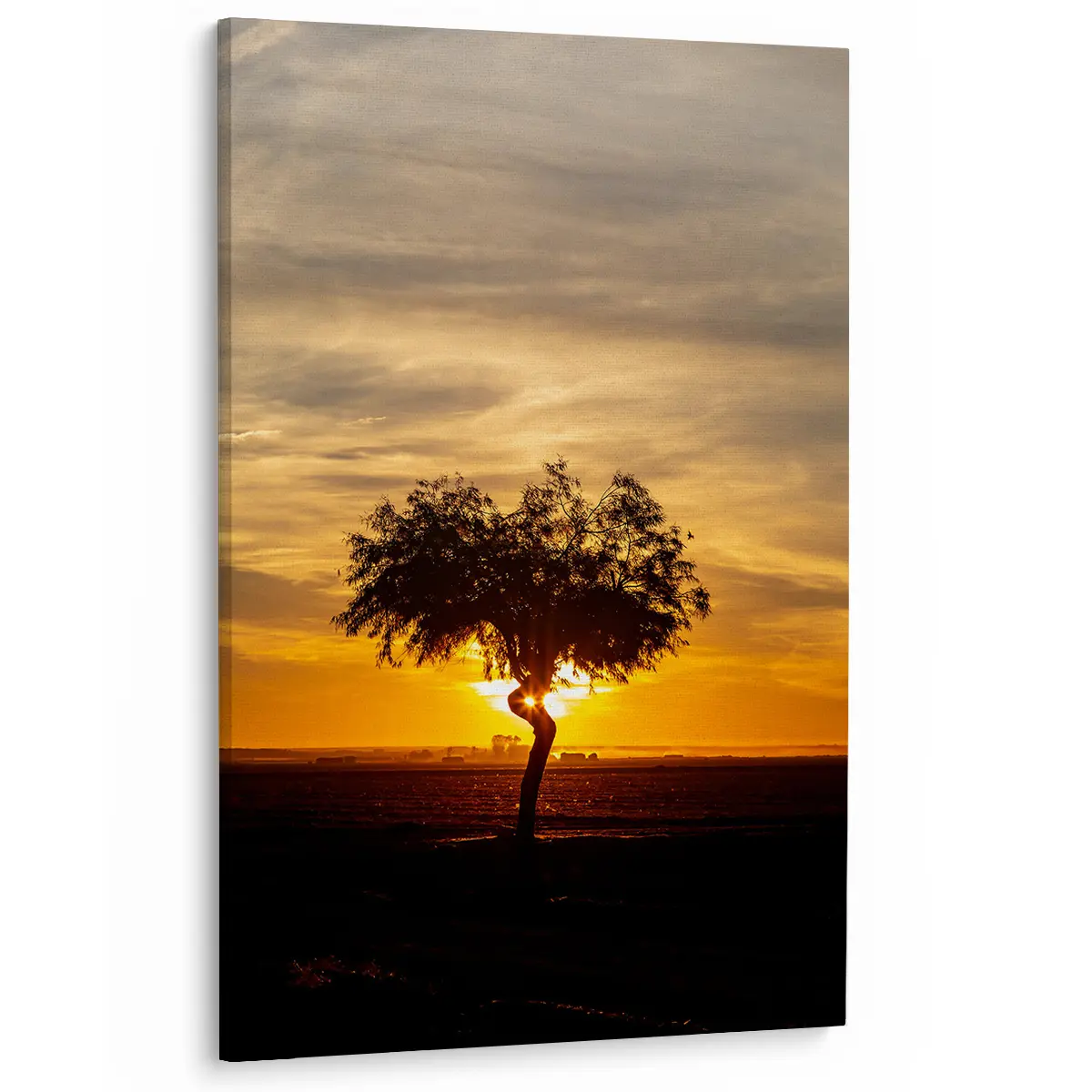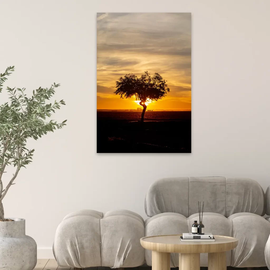 Een adembenemende zonsondergang met een solitaire boom als silhouet tegen de dramatische gouden hemel. De warme oranje en gele tinten van de lucht creëren een krachtige, emotionele sfeer die rust en contemplatie oproept. Als wanddecoratie brengt deze print een gevoel van sereniteit en natuurlijke schoonheid in elk interieur, perfect voor ruimtes waar je een moment van stilte en bezinning wilt creëren.