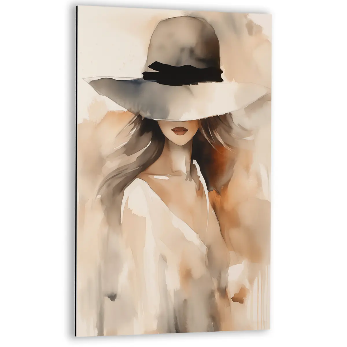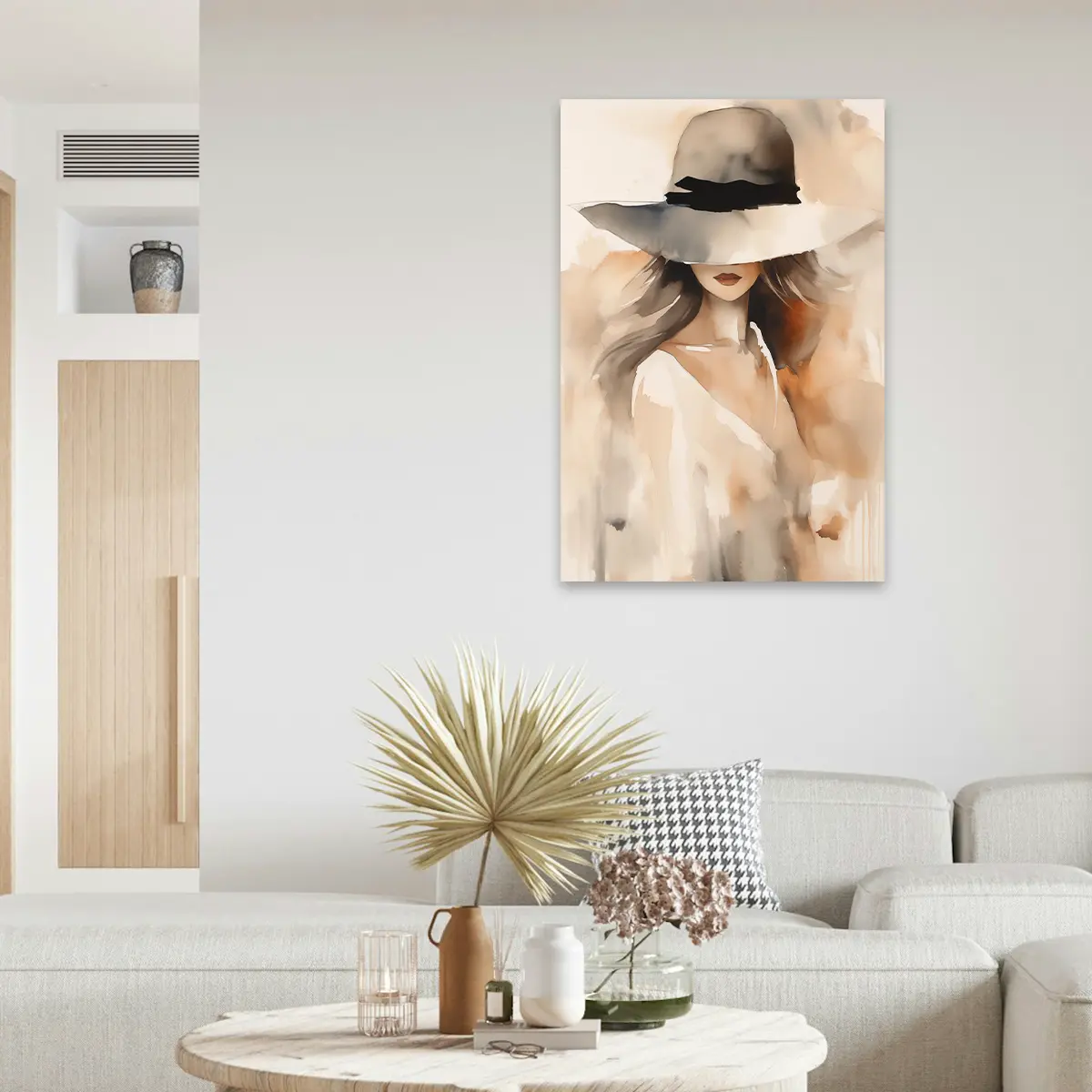 Een verfijnde aquarel van een elegante vrouw met een grote hoed, uitgevoerd in zachte, neutrale tinten. De vloeiende penseelstreken en de subtiele kleurovergangen creëren een tijdloze, romantische uitstraling. Als wanddecoratie voegt deze print een vleugje elegantie en artistieke verfijning toe aan elk interieur, perfect voor een slaapkamer of kleedkamer.