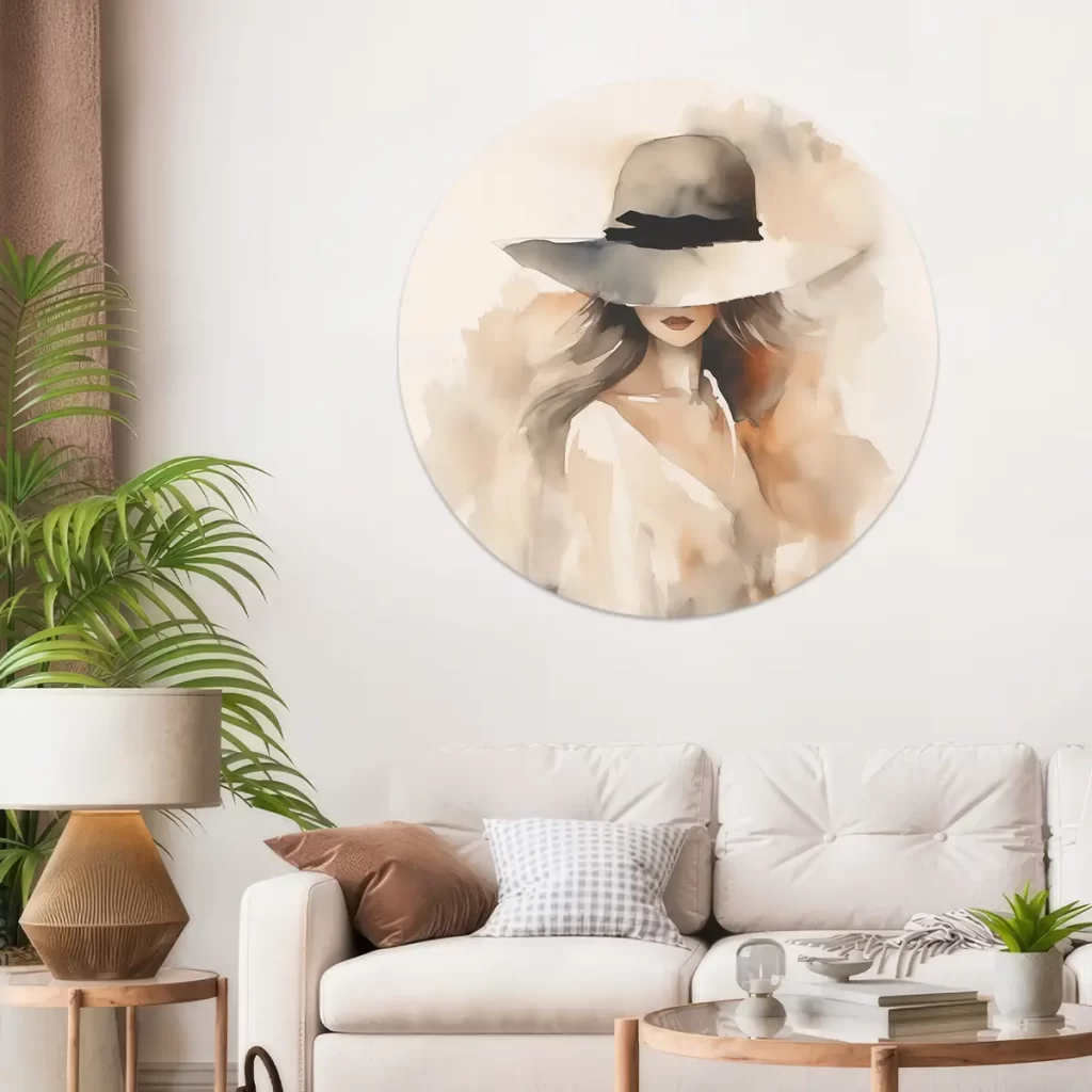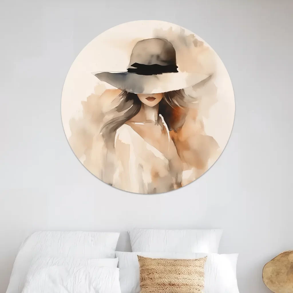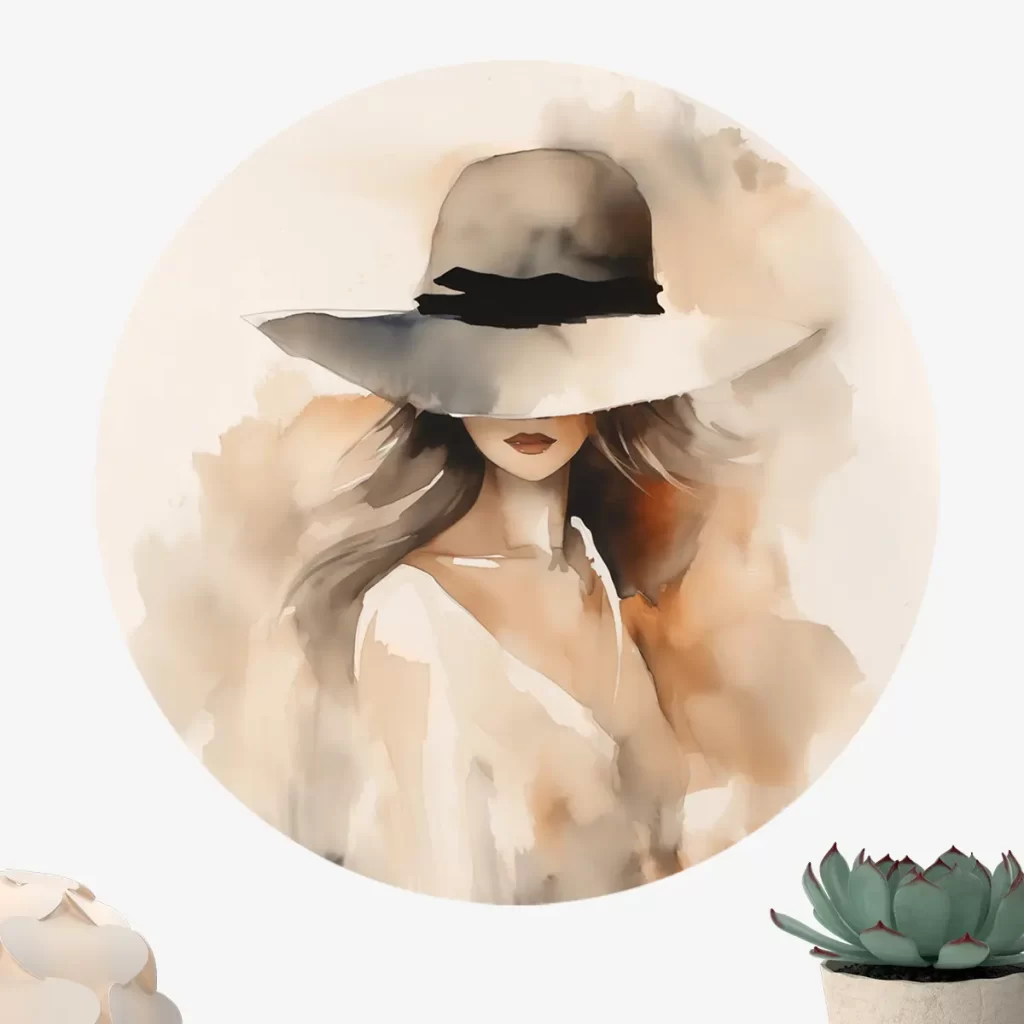 Een verfijnde aquarel van een elegante vrouw met een grote hoed, uitgevoerd in zachte, neutrale tinten. De vloeiende penseelstreken en de subtiele kleurovergangen creëren een tijdloze, romantische uitstraling. Als wanddecoratie voegt deze print een vleugje elegantie en artistieke verfijning toe aan elk interieur, perfect voor een slaapkamer of kleedkamer.
