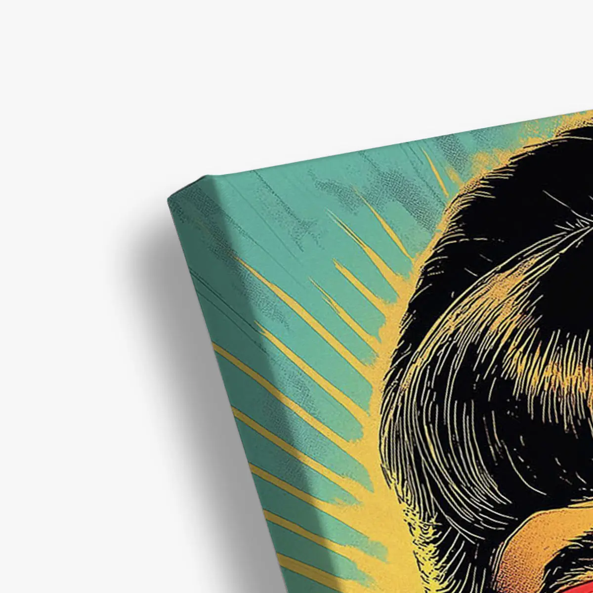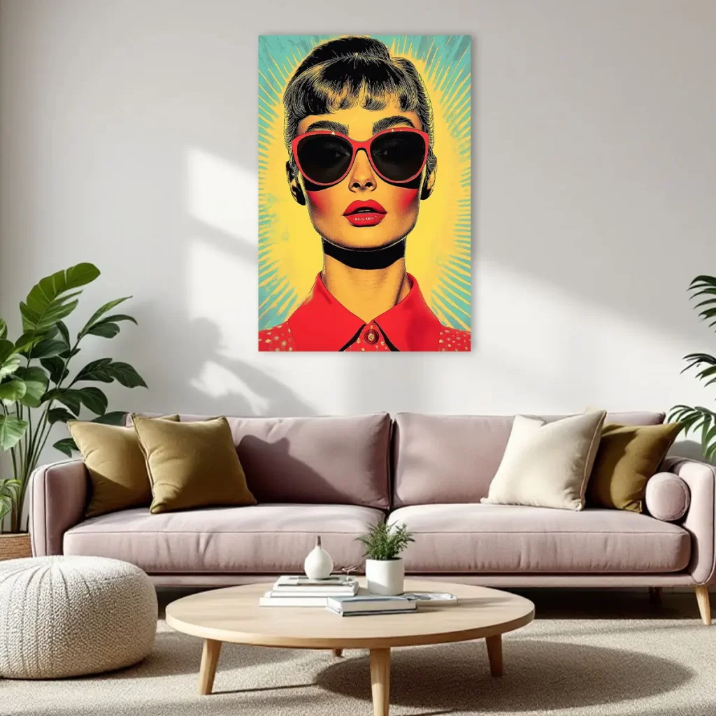 Een krachtige pop art interpretatie van een glamoureuze vrouw met rode zonnebril en lippen tegen een levendige geel-groene achtergrond. De vintage jaren ’60 esthetiek en de gedurfde kleurcombinaties maken deze print tot een echte eyecatcher. Als wanddecoratie voegt dit kunstwerk direct karakter en retro glamour toe aan elk modern interieur, perfect voor liefhebbers van vintage design en pop art.