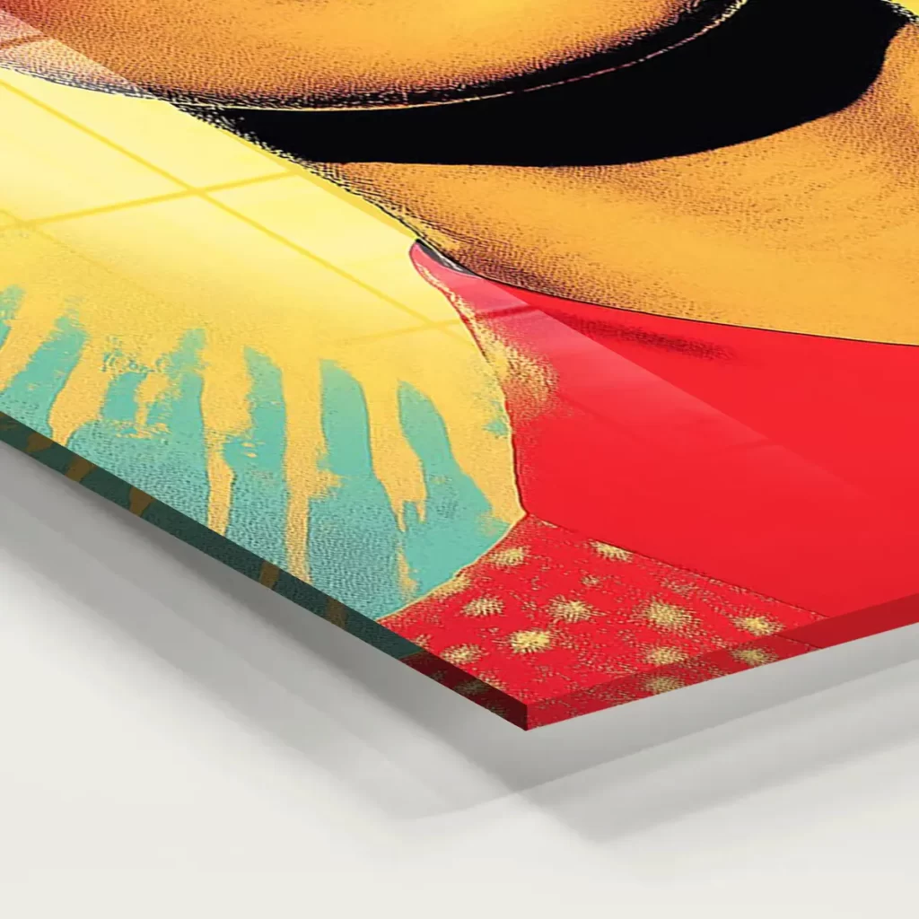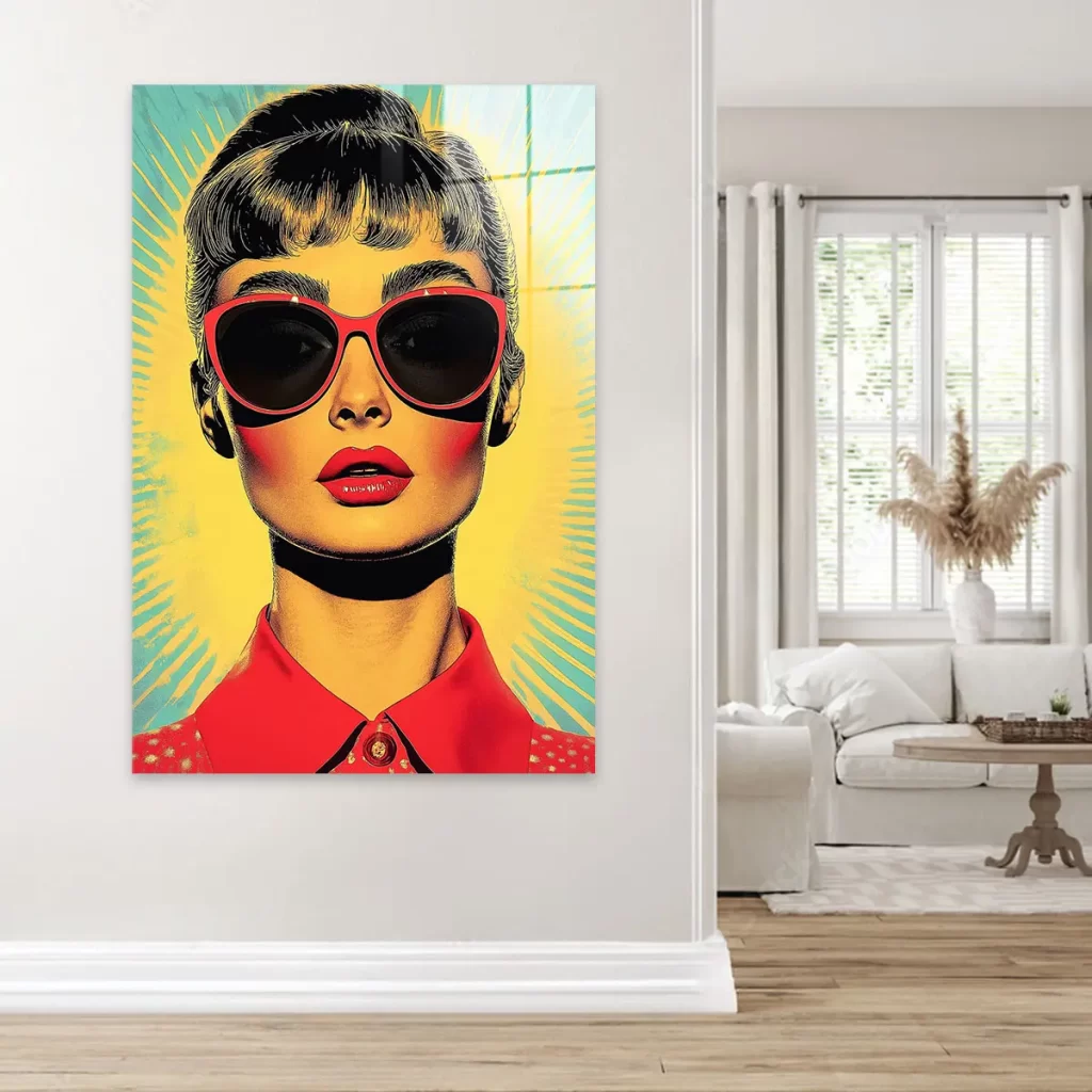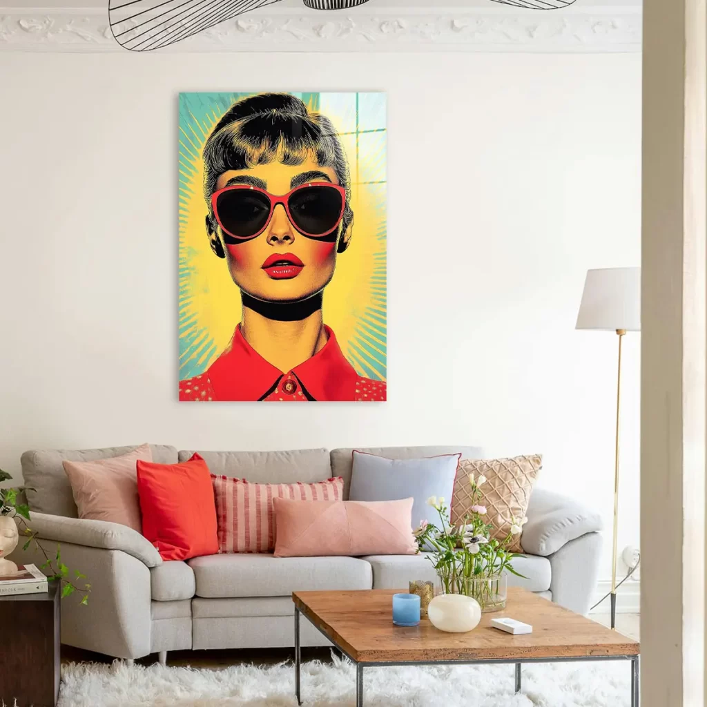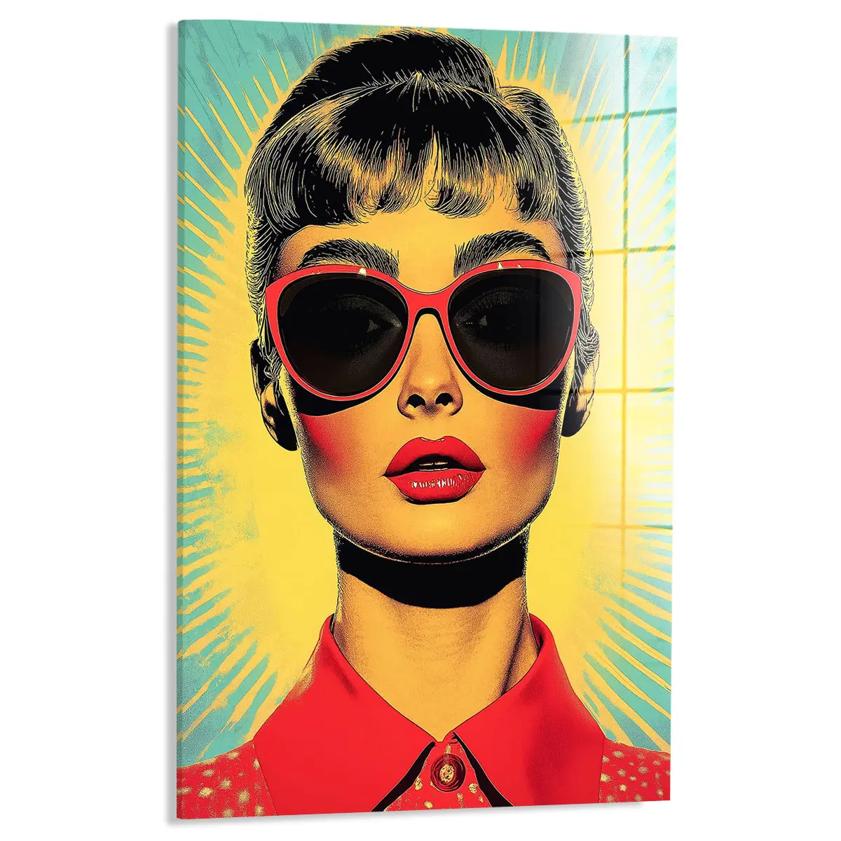 Een krachtige pop art interpretatie van een glamoureuze vrouw met rode zonnebril en lippen tegen een levendige geel-groene achtergrond. De vintage jaren '60 esthetiek en de gedurfde kleurcombinaties maken deze print tot een echte eyecatcher. Als wanddecoratie voegt dit kunstwerk direct karakter en retro glamour toe aan elk modern interieur, perfect voor liefhebbers van vintage design en pop art.