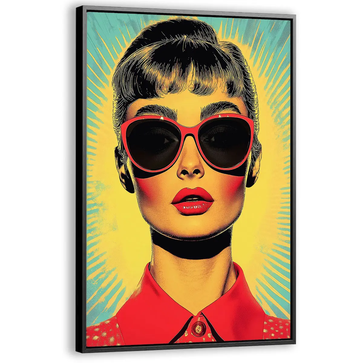 Een krachtige pop art interpretatie van een glamoureuze vrouw met rode zonnebril en lippen tegen een levendige geel-groene achtergrond. De vintage jaren '60 esthetiek en de gedurfde kleurcombinaties maken deze print tot een echte eyecatcher. Als wanddecoratie voegt dit kunstwerk direct karakter en retro glamour toe aan elk modern interieur, perfect voor liefhebbers van vintage design en pop art.