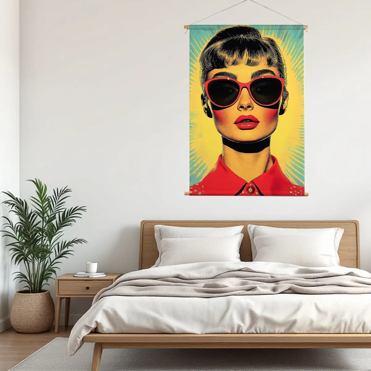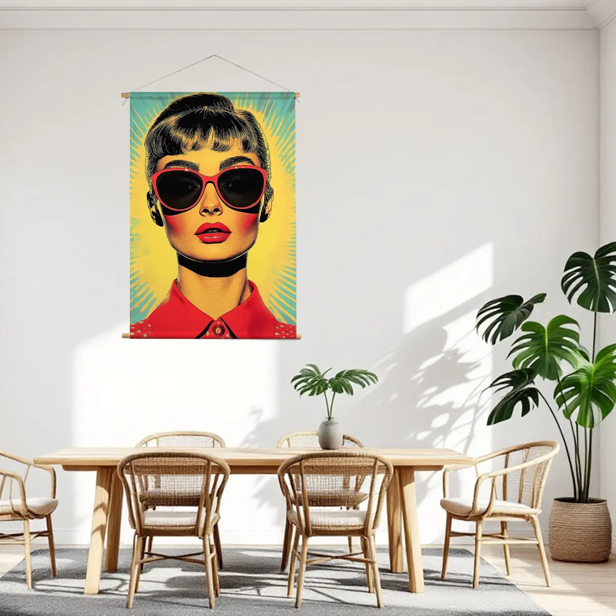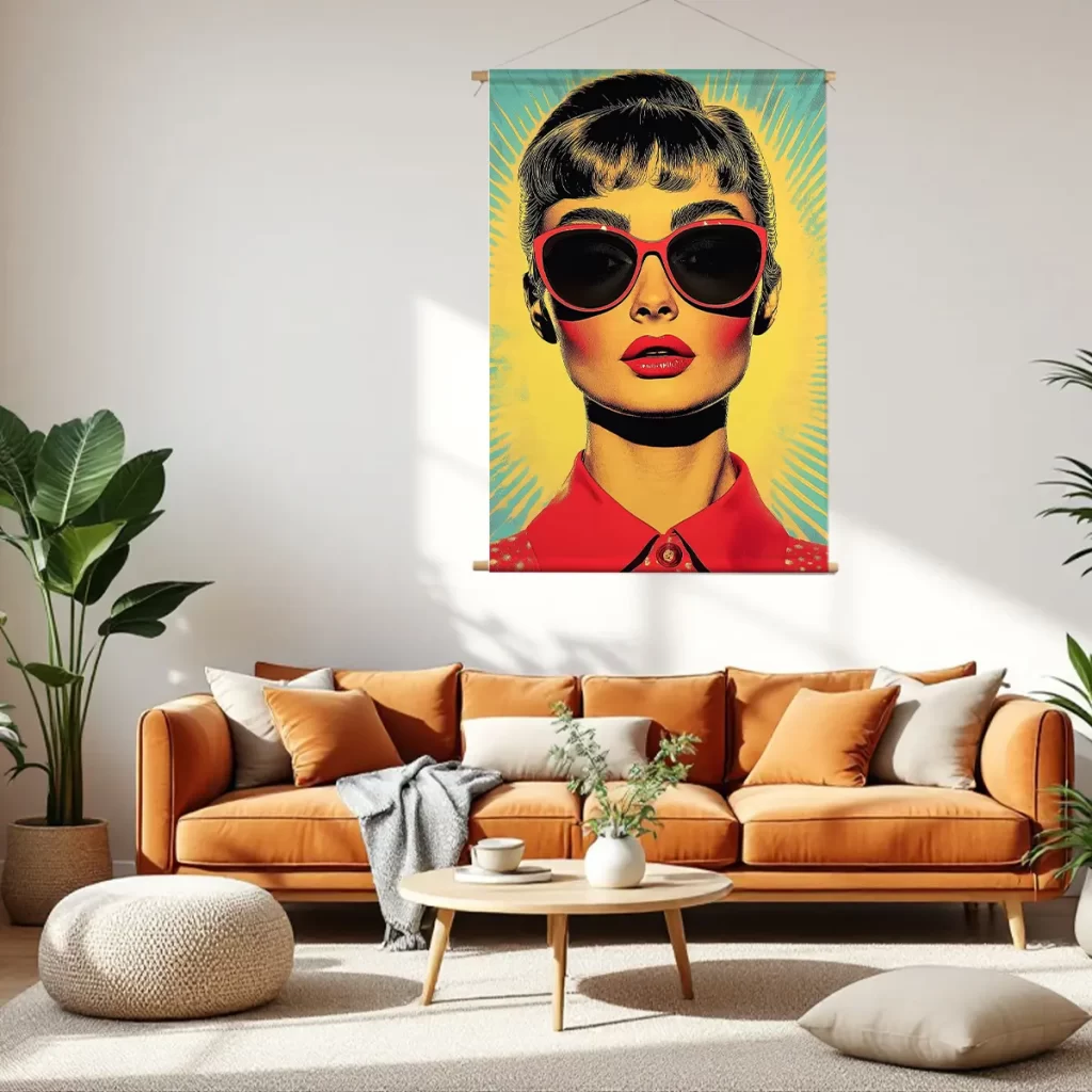 Een krachtige pop art interpretatie van een glamoureuze vrouw met rode zonnebril en lippen tegen een levendige geel-groene achtergrond. De vintage jaren ’60 esthetiek en de gedurfde kleurcombinaties maken deze print tot een echte eyecatcher. Als wanddecoratie voegt dit kunstwerk direct karakter en retro glamour toe aan elk modern interieur, perfect voor liefhebbers van vintage design en pop art.