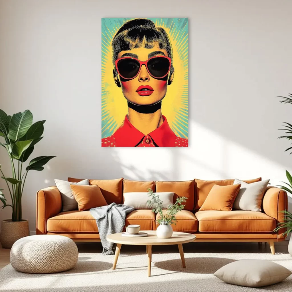 Een krachtige pop art interpretatie van een glamoureuze vrouw met rode zonnebril en lippen tegen een levendige geel-groene achtergrond. De vintage jaren ’60 esthetiek en de gedurfde kleurcombinaties maken deze print tot een echte eyecatcher. Als wanddecoratie voegt dit kunstwerk direct karakter en retro glamour toe aan elk modern interieur, perfect voor liefhebbers van vintage design en pop art.
