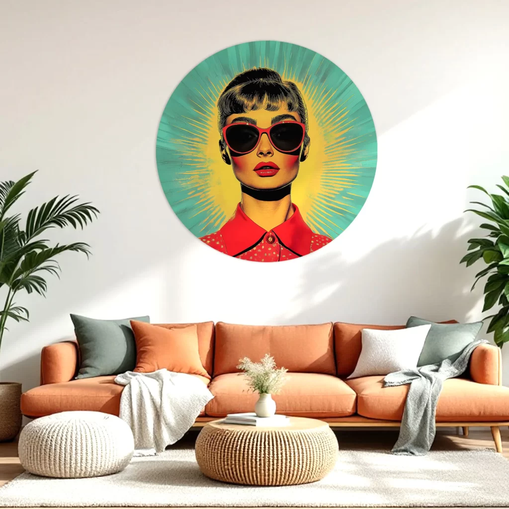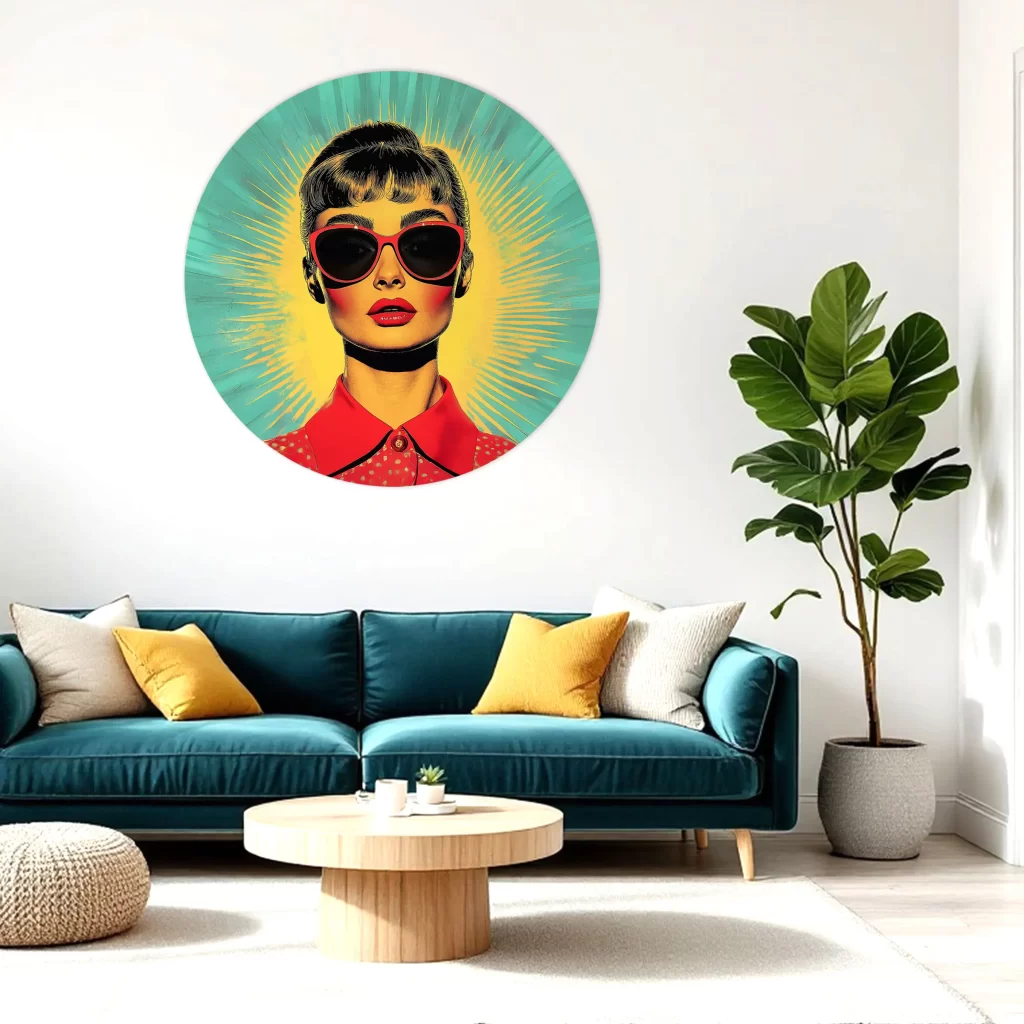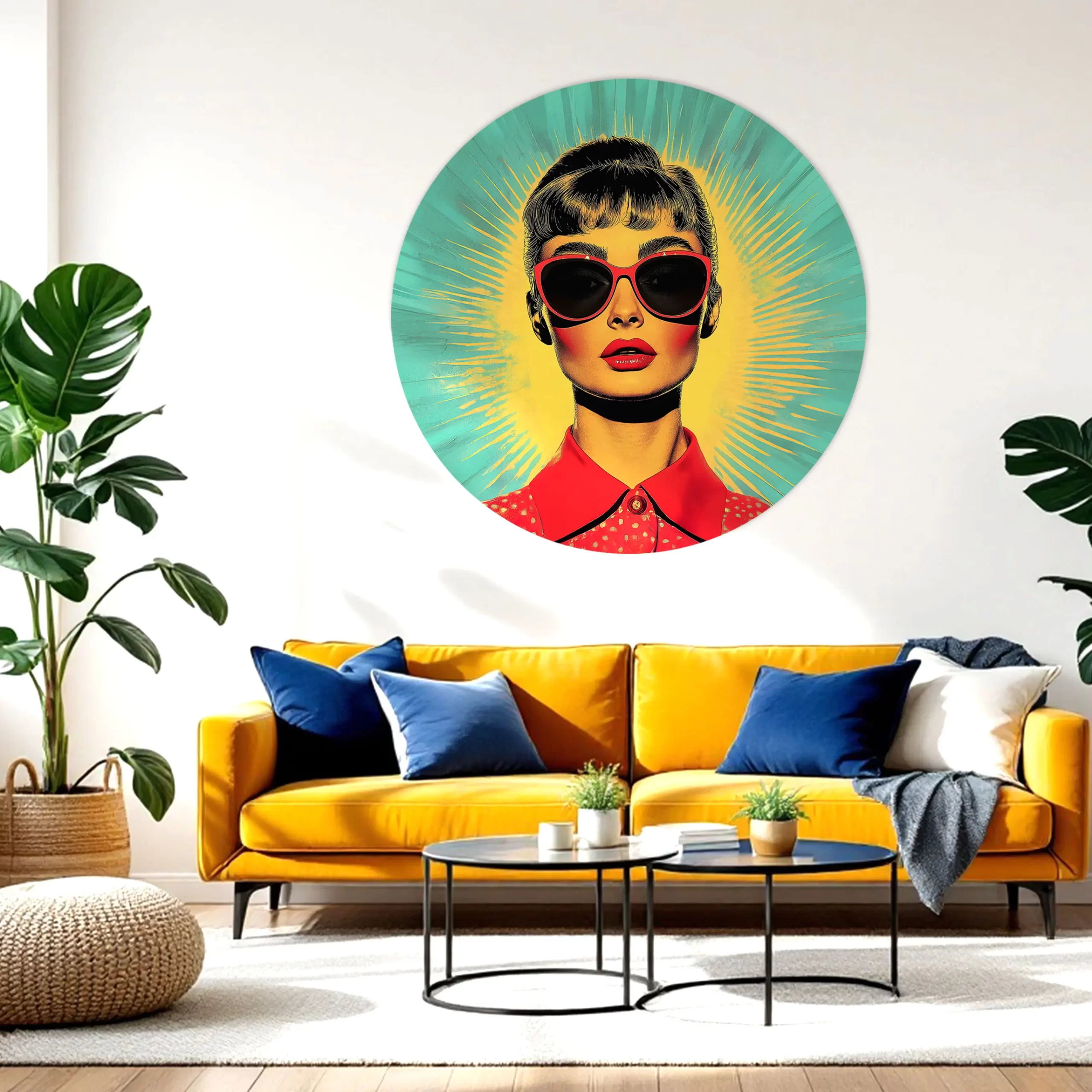 Een krachtige pop art interpretatie van een glamoureuze vrouw met rode zonnebril en lippen tegen een levendige geel-groene achtergrond. De vintage jaren ’60 esthetiek en de gedurfde kleurcombinaties maken deze print tot een echte eyecatcher. Als wanddecoratie voegt dit kunstwerk direct karakter en retro glamour toe aan elk modern interieur, perfect voor liefhebbers van vintage design en pop art.