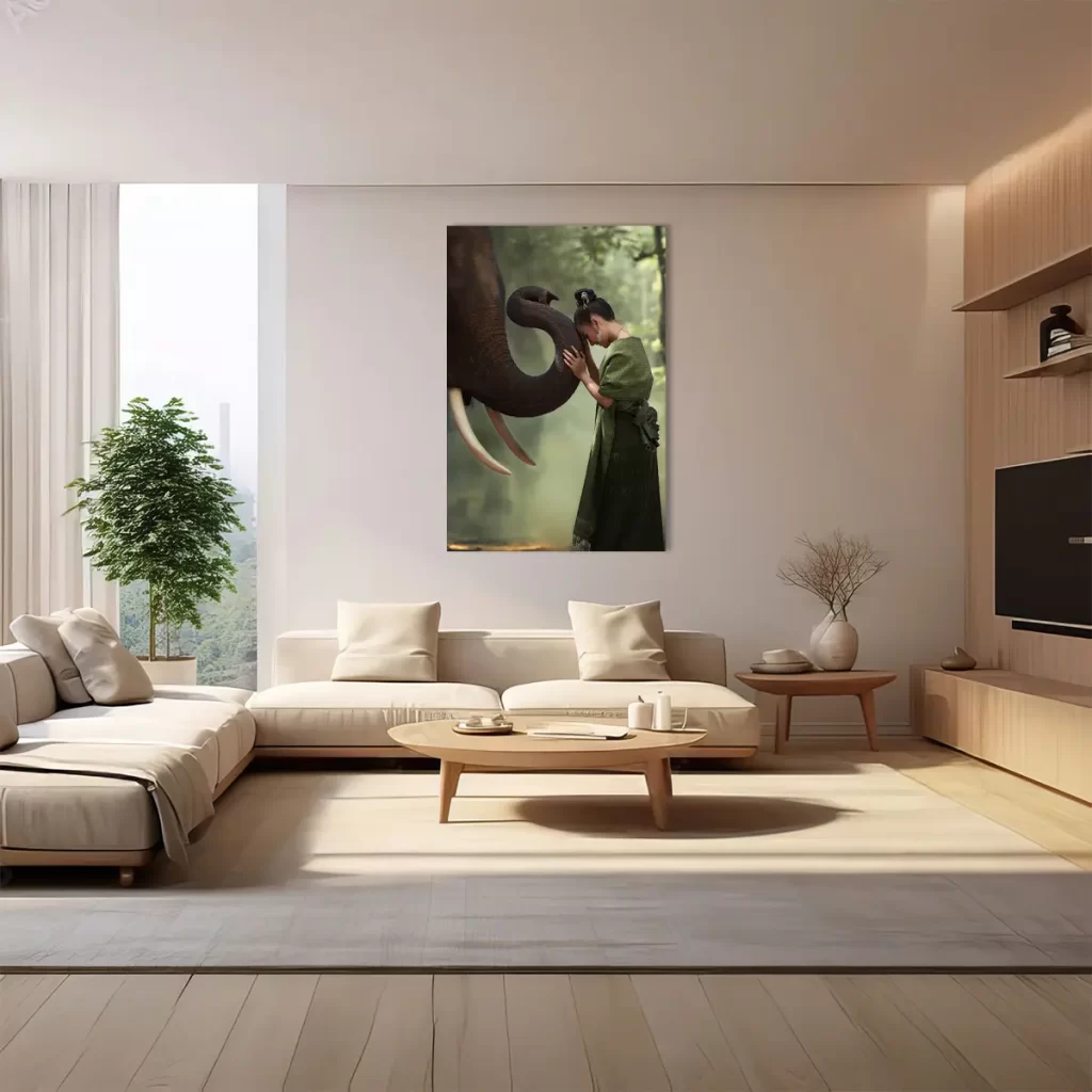 Een indrukwekkend beeld van een intiem moment tussen een vrouw in traditionele Thaise kleding en een majestueuze olifant. De zachte groene tinten van haar kleding harmoniëren prachtig met de natuurlijke achtergrond, terwijl het moment van verbinding een gevoel van rust en respect voor de natuur oproept. Als wanddecoratie brengt deze print een vleugje Aziatische sereniteit en culturele diepgang in elk interieur.