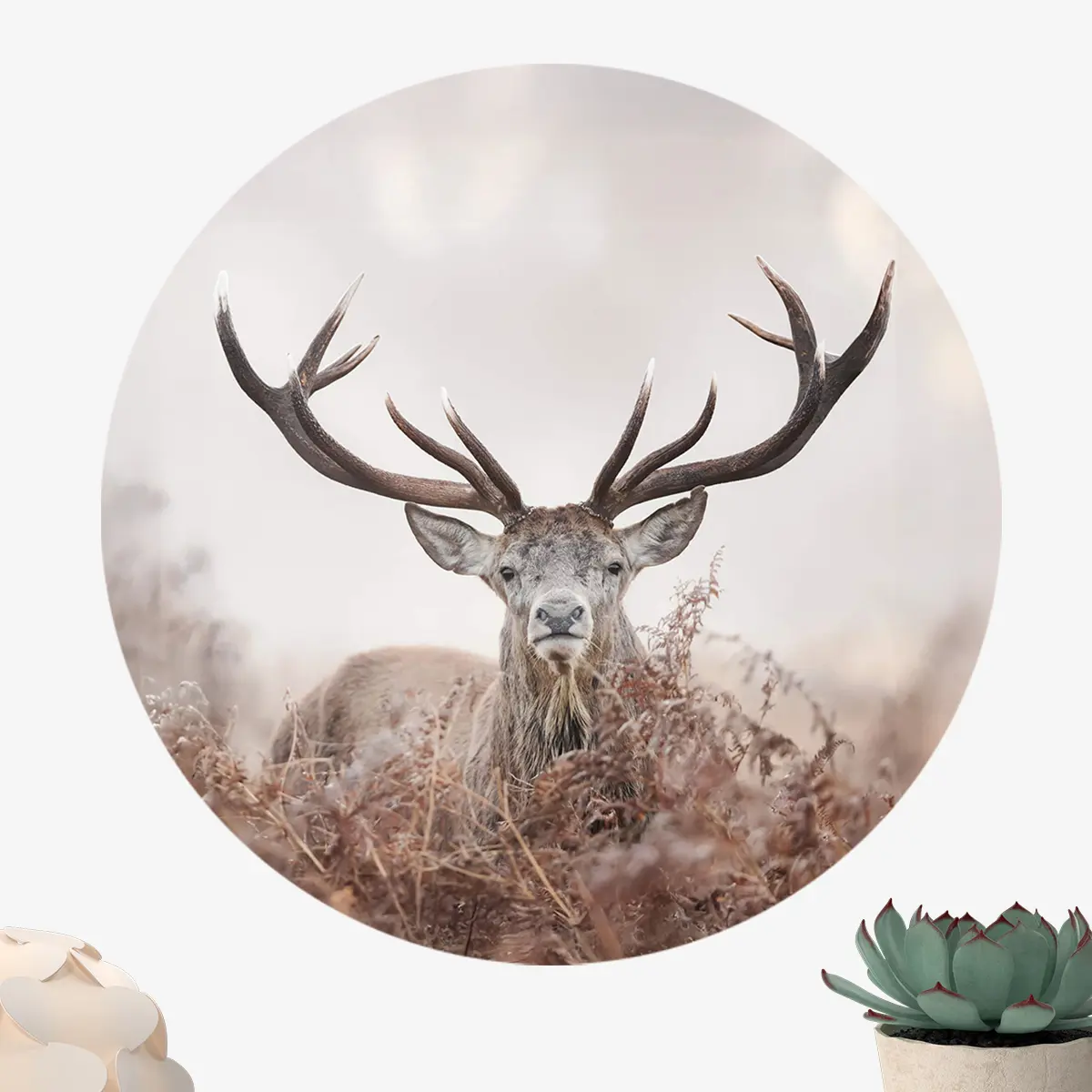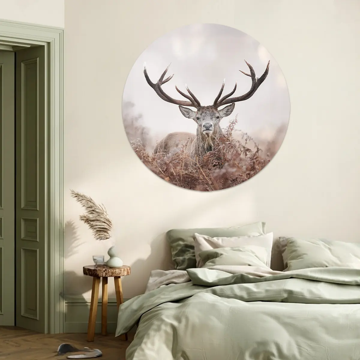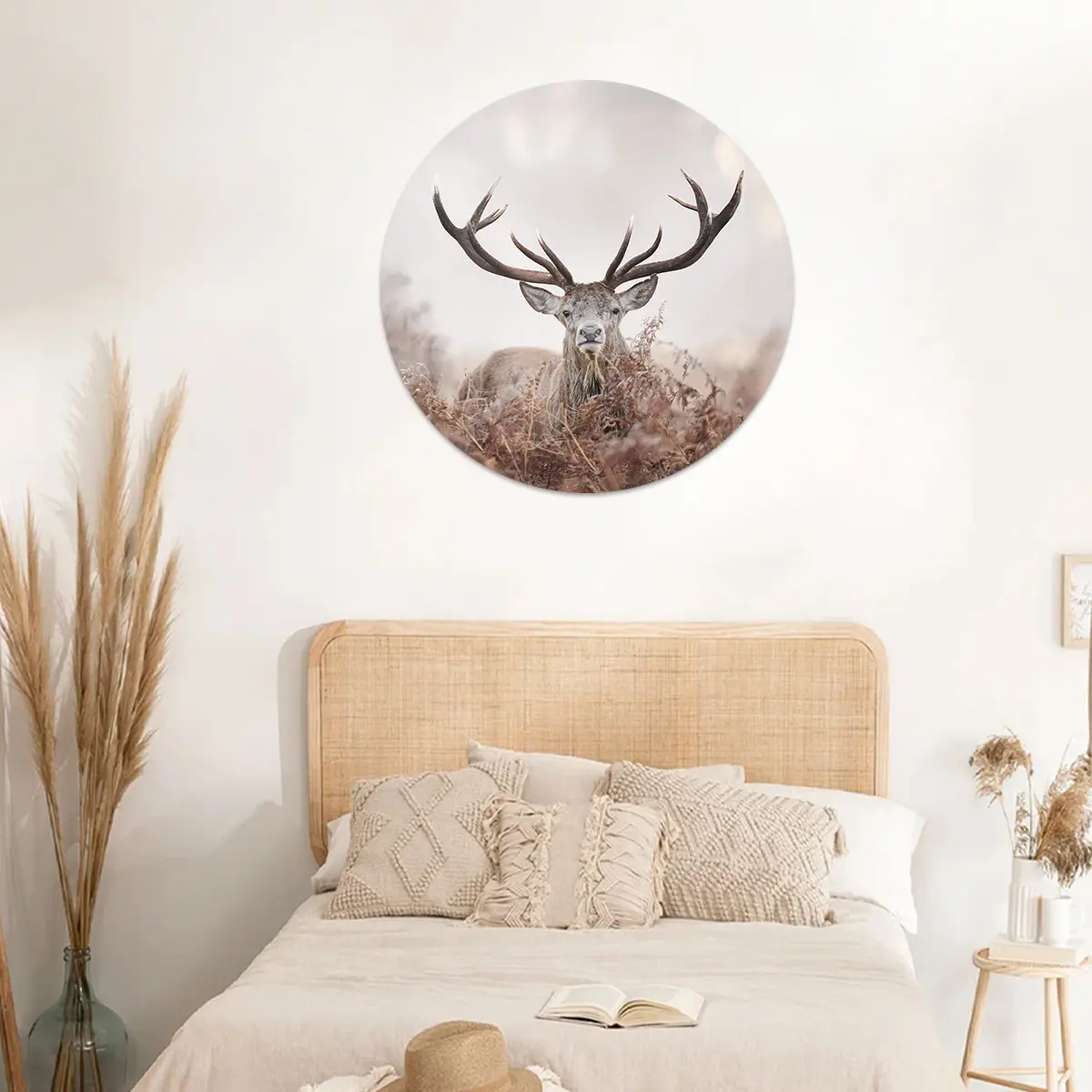 Een prachtig kunstwerk dat een indrukwekkend hert toont, staand tussen het zachte herfstblad, met zijn imposante gewei dat doet denken aan oude bomen. De mistige achtergrond creëert een rustige en dromerige sfeer, die de serene, oplettende aanwezigheid van het hert in zijn bos benadrukt. Dit schilderij brengt de nobele en vredige sfeer van de natuur in uw huis.