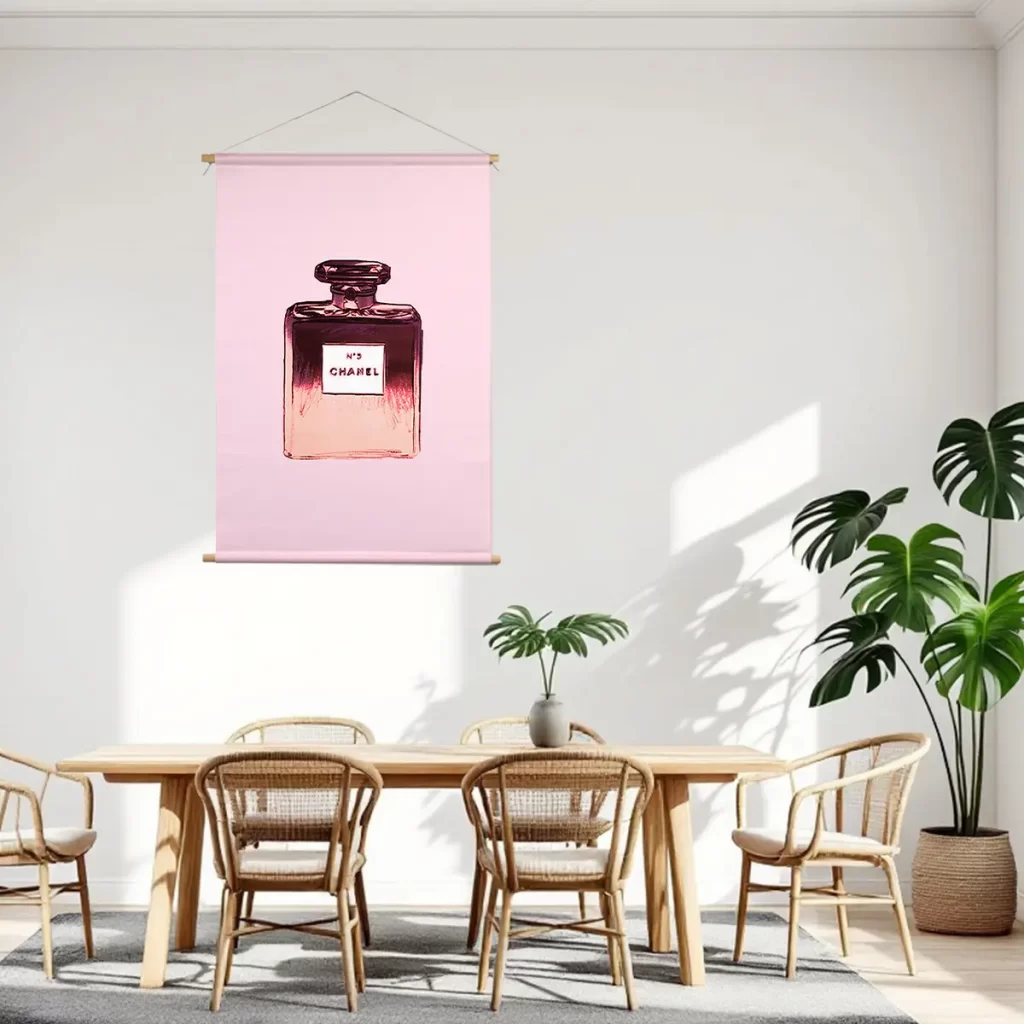 Een stijlvolle pop art interpretatie van een klassieke parfumfles in elegante roze en paarse tinten. De minimalistische achtergrond en de glanzende textuur van de fles creëren een luxueuze, moderne uitstraling. Als wanddecoratie brengt deze print een vleugje glamour en verfijning in elk interieur, perfect voor een slaapkamer, kleedkamer of badkamer waar elegantie centraal staat.