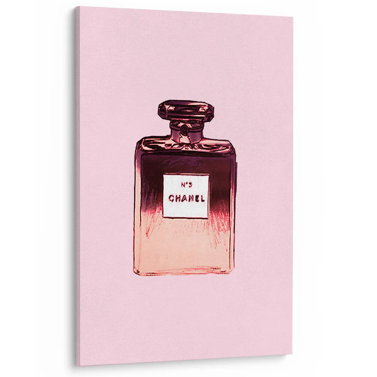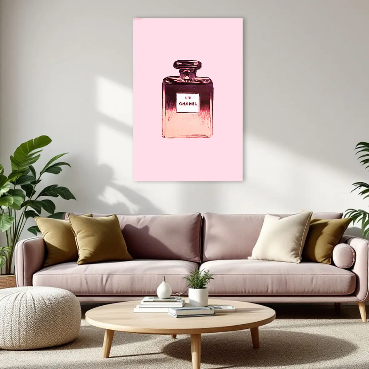 Een stijlvolle pop art interpretatie van een klassieke parfumfles in elegante roze en paarse tinten. De minimalistische achtergrond en de glanzende textuur van de fles creëren een luxueuze, moderne uitstraling. Als wanddecoratie brengt deze print een vleugje glamour en verfijning in elk interieur, perfect voor een slaapkamer, kleedkamer of badkamer waar elegantie centraal staat.