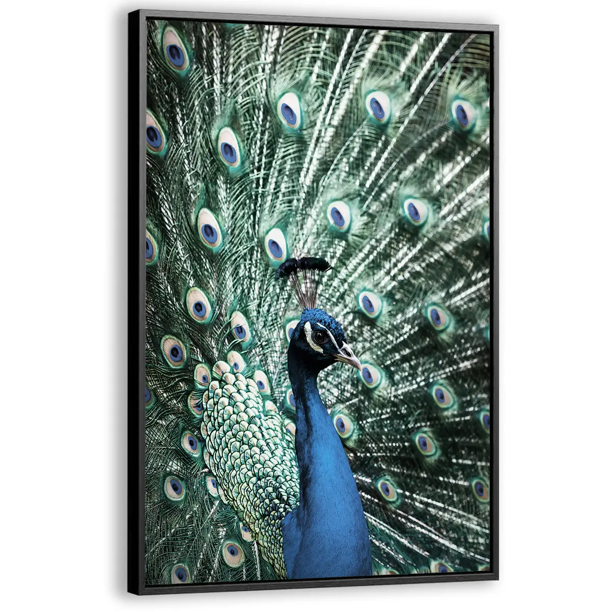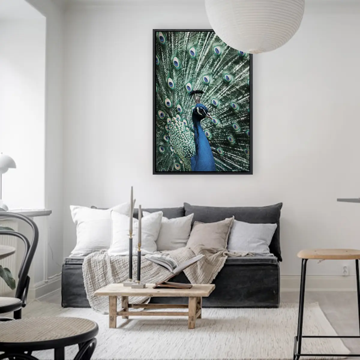Dit kunstwerk toont de trotse en indrukwekkende schoonheid van een Indiase pauw, met zijn schitterende veren volledig uitgespreid. Het schilderij weerspiegelt de kenmerkende flamboyantie van het dier en de pracht van de natuur, met levendige kleuren en gedetailleerde.