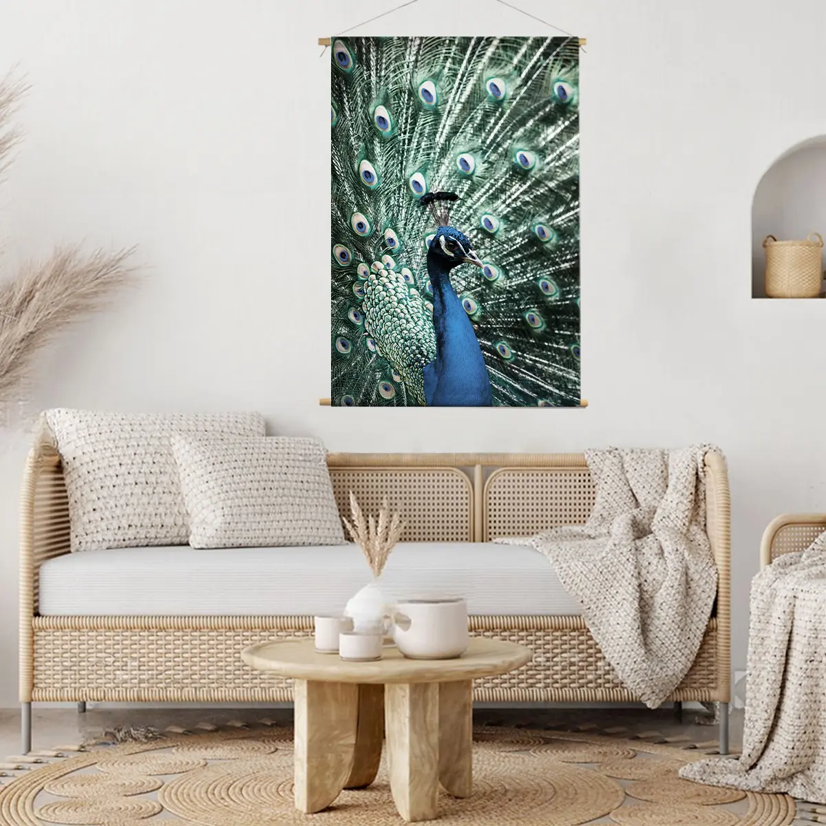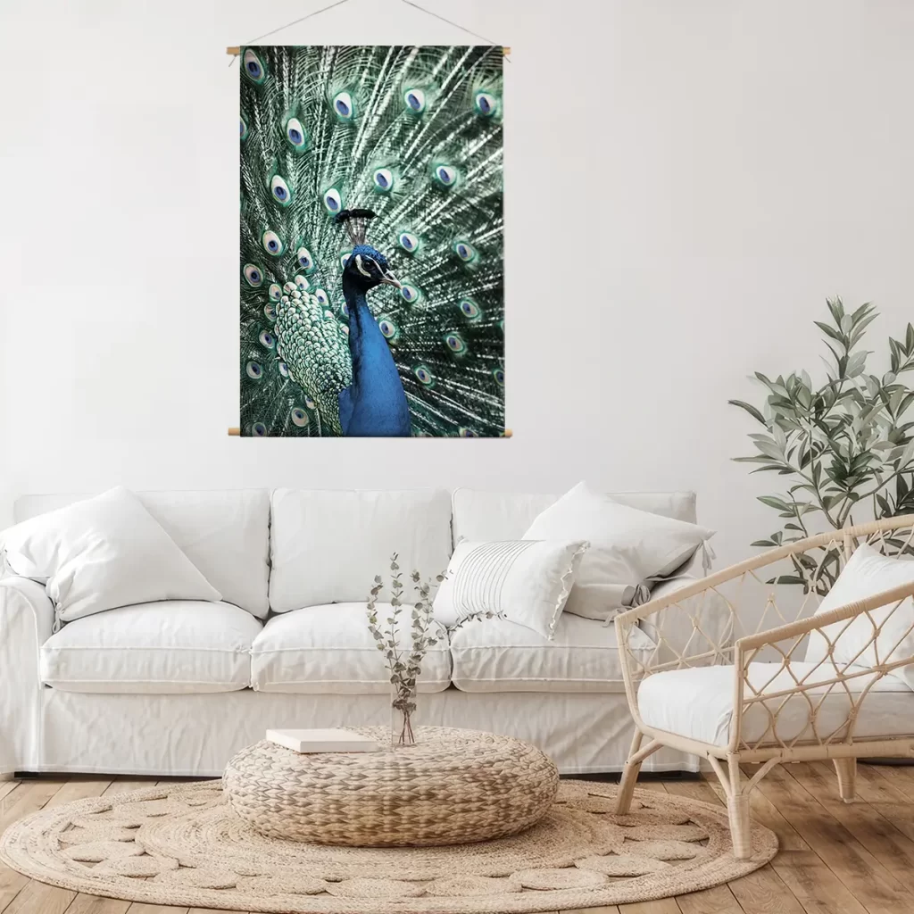 Dit kunstwerk toont de trotse en indrukwekkende schoonheid van een Indiase pauw, met zijn schitterende veren volledig uitgespreid. Het schilderij weerspiegelt de kenmerkende flamboyantie van het dier en de pracht van de natuur, met levendige kleuren en gedetailleerde.