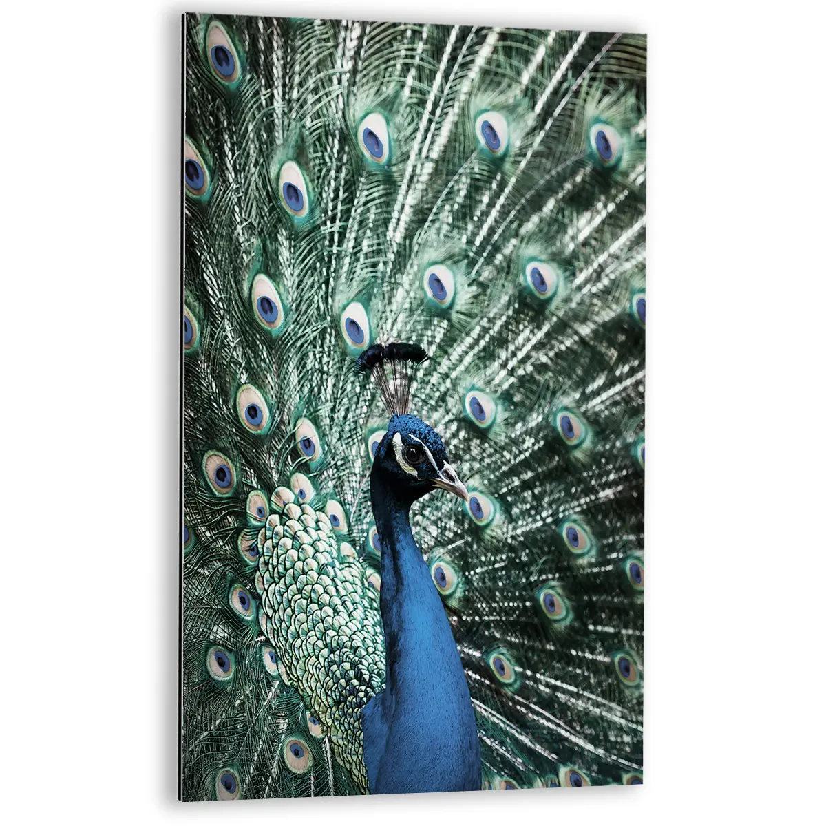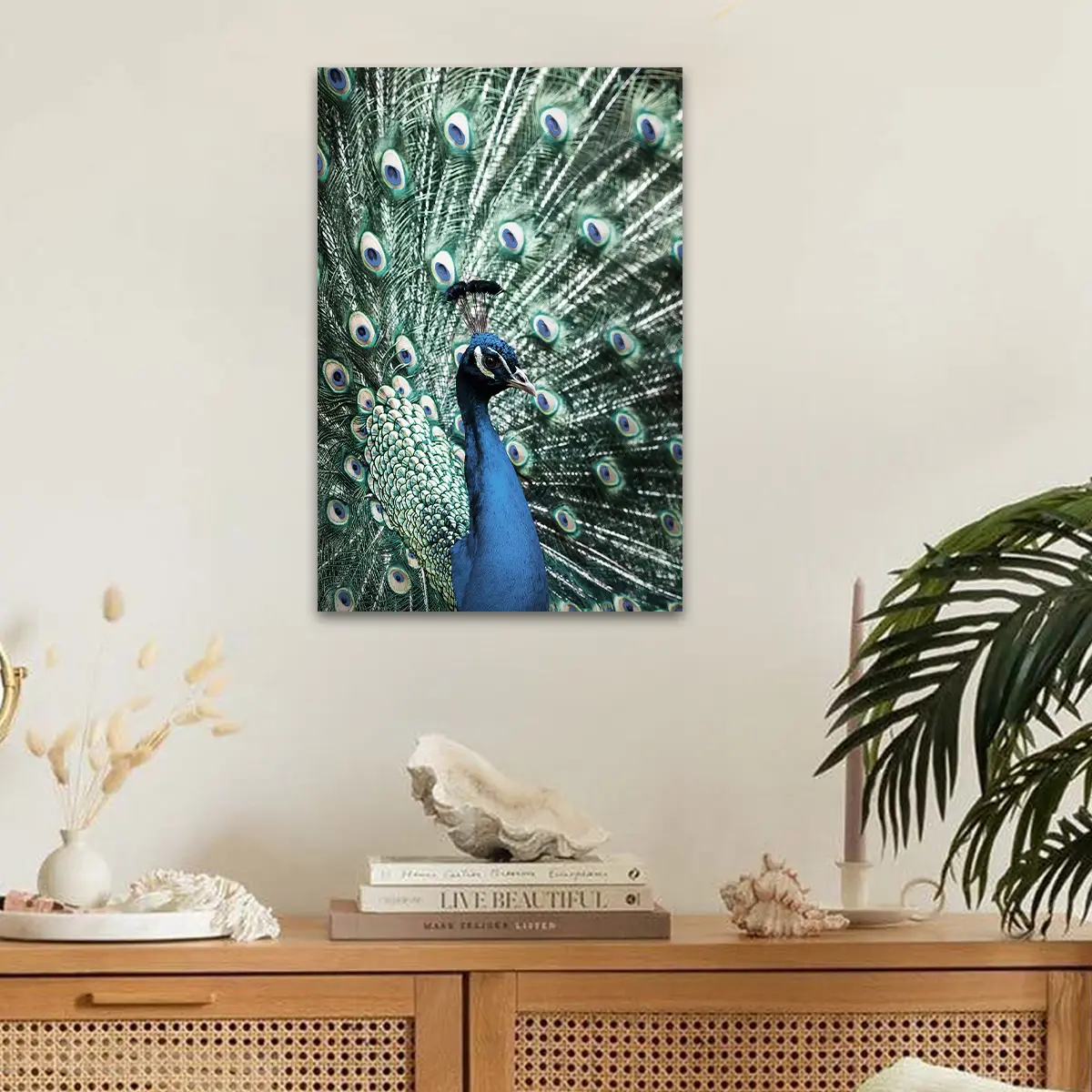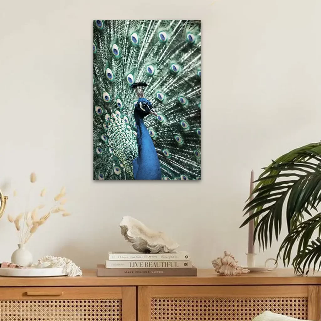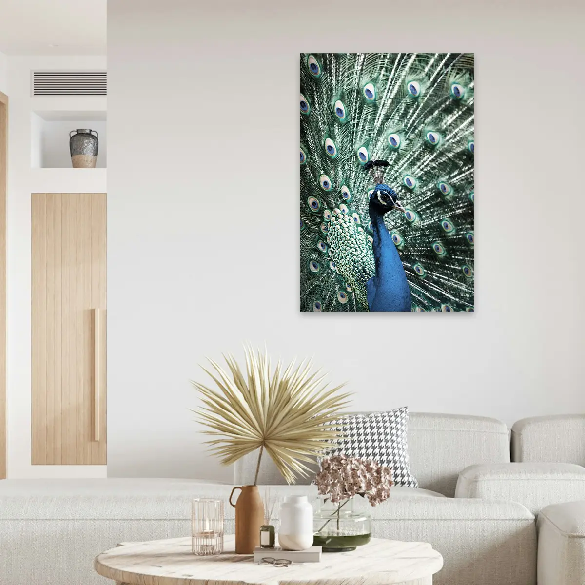 Dit kunstwerk toont de trotse en indrukwekkende schoonheid van een Indiase pauw, met zijn schitterende veren volledig uitgespreid. Het schilderij weerspiegelt de kenmerkende flamboyantie van het dier en de pracht van de natuur, met levendige kleuren en gedetailleerde.
