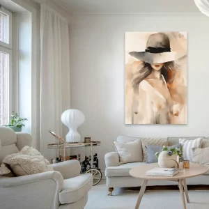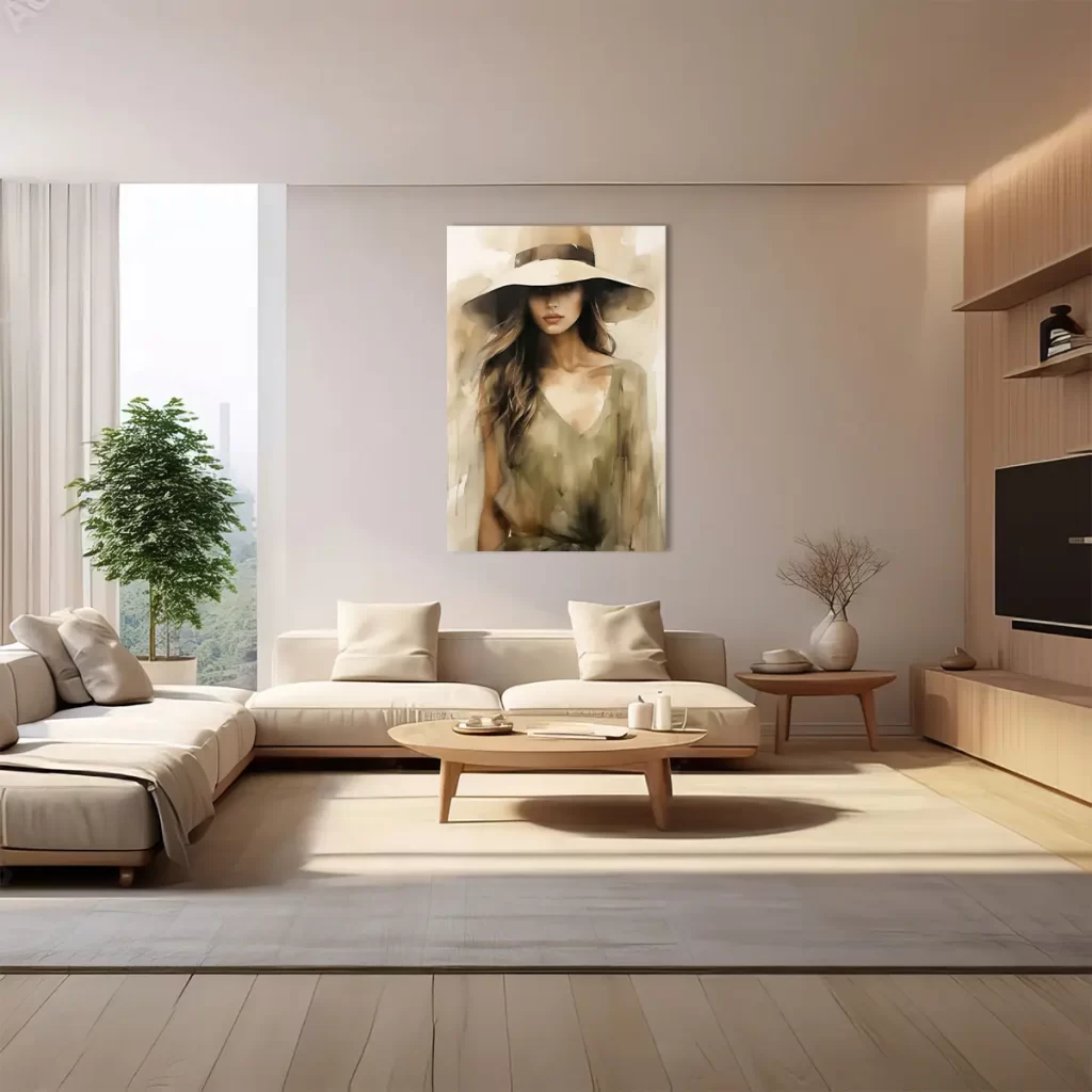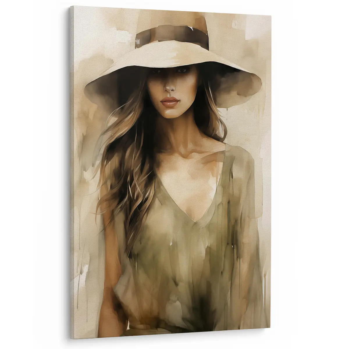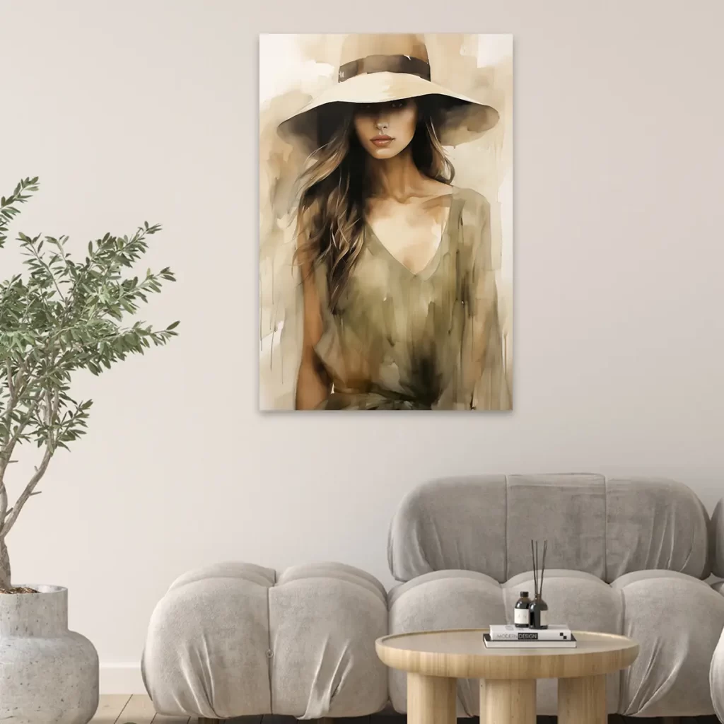 Deze Jonge Vrouw is een betoverend schilderij dat een fascinerende vrouw toont in zachte olijfgroene tinten. Haar blik is sterk maar kalm, en de breedgerande hoed werpt een schaduw over een deel van haar gezicht, wat een gevoel van mystiek en elegantie creëert. De delicate penseelstreken met aquarel benadrukken haar vrouwelijke schoonheid en maakt van deze wanddecoratie een prachtig middelpunt voor elk modern interieur.