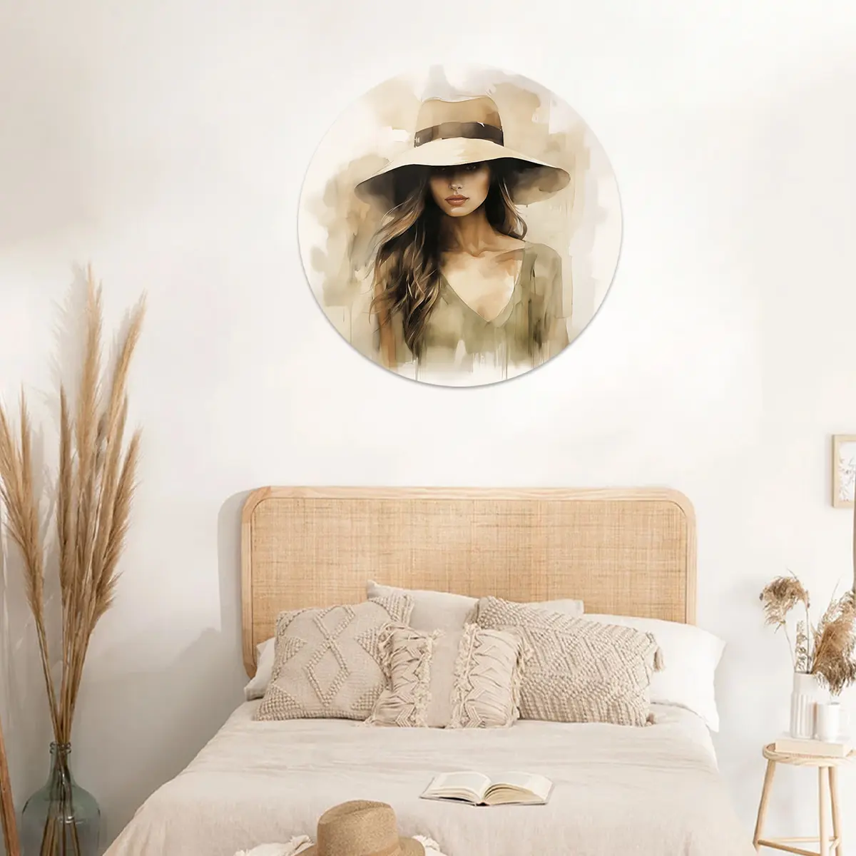Deze Jonge Vrouw is een betoverend schilderij dat een fascinerende vrouw toont in zachte olijfgroene tinten. Haar blik is sterk maar kalm, en de breedgerande hoed werpt een schaduw over een deel van haar gezicht, wat een gevoel van mystiek en elegantie creëert. De delicate penseelstreken met aquarel benadrukken haar vrouwelijke schoonheid en maakt van deze wanddecoratie een prachtig middelpunt voor elk modern interieur.