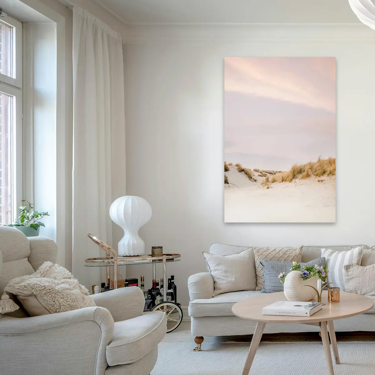 Een poëtisch beeld van helmgras wiegend in de duinen, gevangen in zachte, romantische tinten. De subtiele kleurschakeringen en de natuurlijke texturen van het helmgras creëren een tijdloos stukje Nederlandse kustschoonheid. Deze print brengt rust en natuurlijke elegantie in huis, perfect voor een stijlvol, natuurlijk interieur.