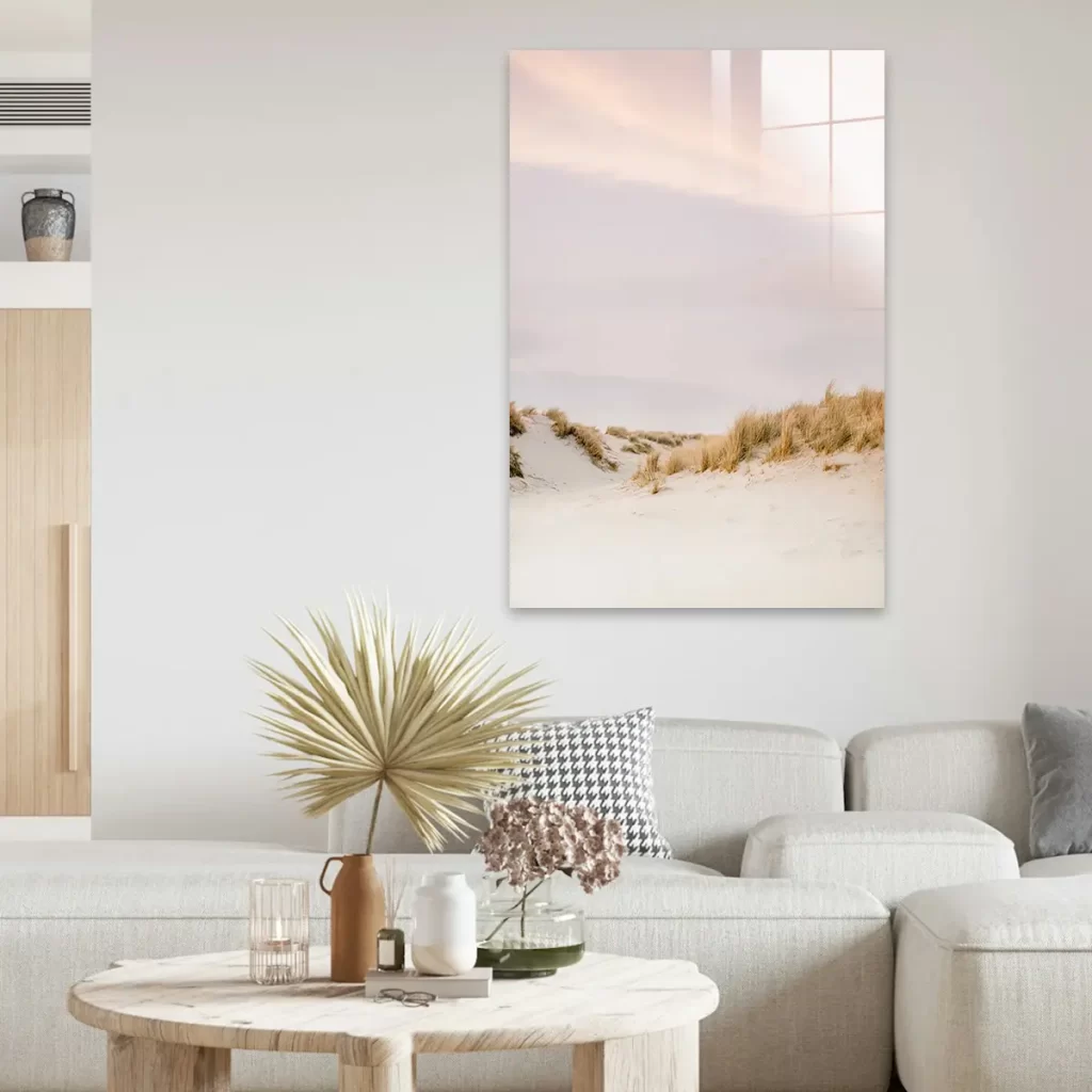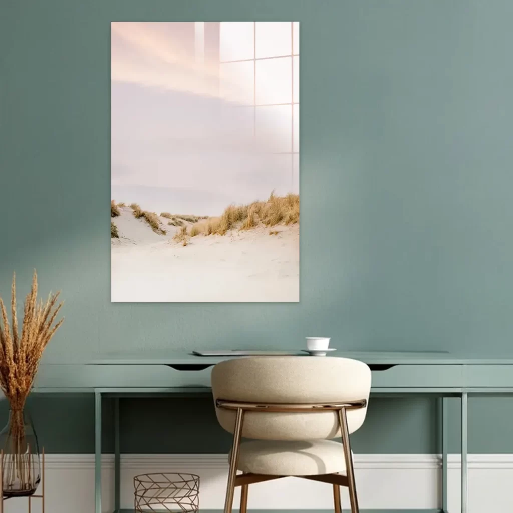 Een poëtisch beeld van helmgras wiegend in de duinen, gevangen in zachte, romantische tinten. De subtiele kleurschakeringen en de natuurlijke texturen van het helmgras creëren een tijdloos stukje Nederlandse kustschoonheid. Deze print brengt rust en natuurlijke elegantie in huis, perfect voor een stijlvol, natuurlijk interieur.