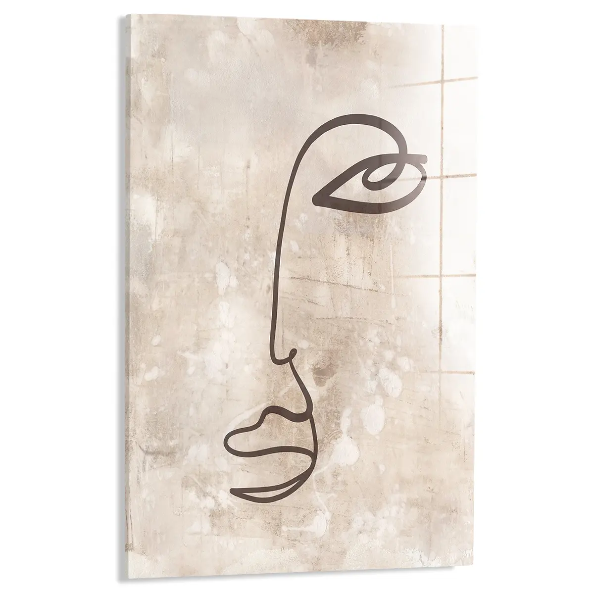 Een elegante, minimalistische lijntekening van een gezichtsprofiel op een subtiele beige achtergrond met textuur. De eenvoud van de enkele lijn creëert een krachtig, modern kunstwerk dat perfect past in een minimalistisch of Scandinavisch interieur. Deze print voegt een vleugje artistieke verfijning toe aan elke ruimte zonder te overheersen.