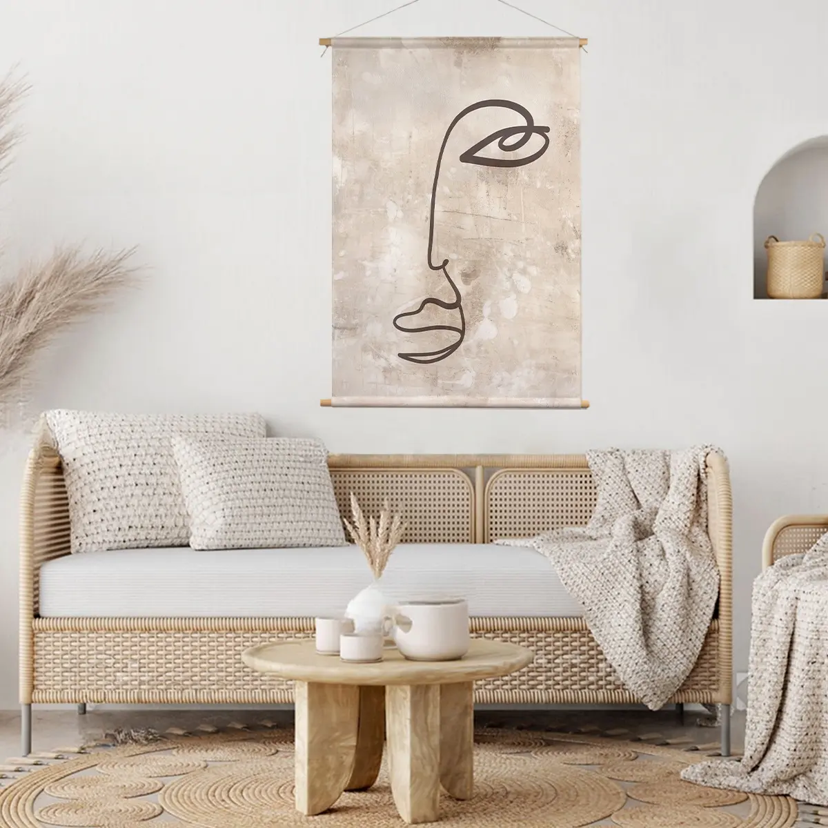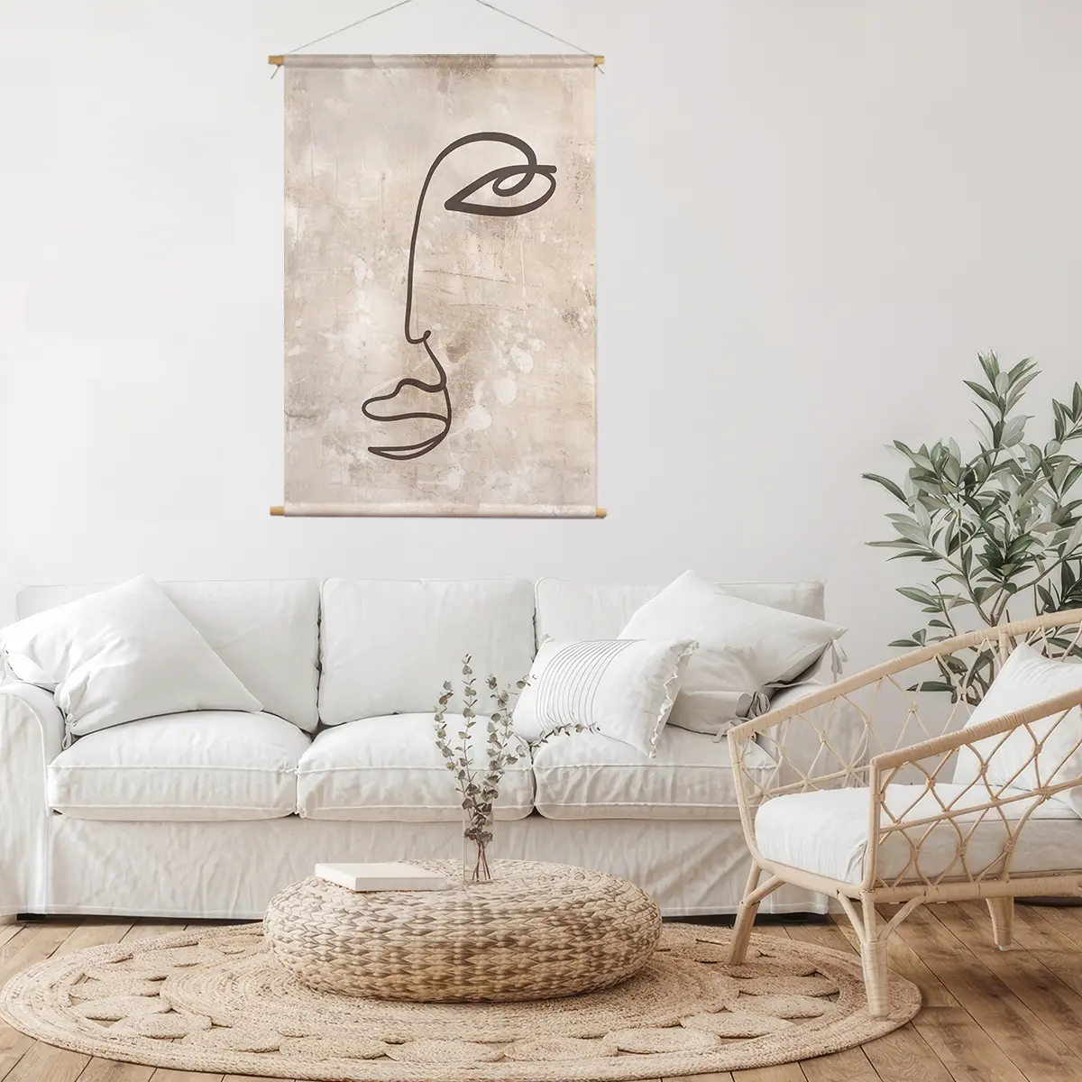 Een elegante, minimalistische lijntekening van een gezichtsprofiel op een subtiele beige achtergrond met textuur. De eenvoud van de enkele lijn creëert een krachtig, modern kunstwerk dat perfect past in een minimalistisch of Scandinavisch interieur. Deze print voegt een vleugje artistieke verfijning toe aan elke ruimte zonder te overheersen.