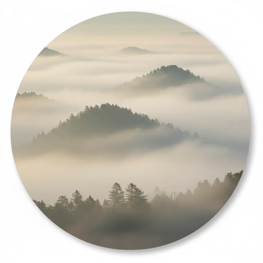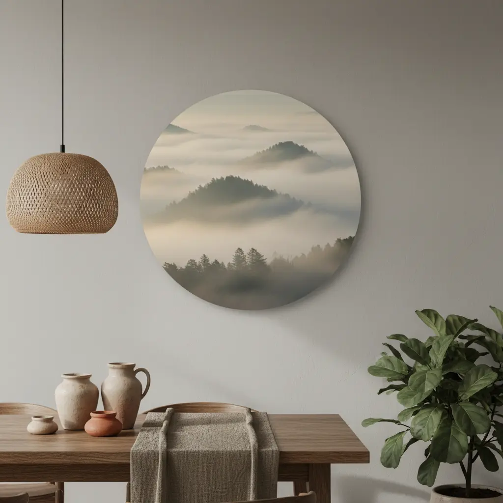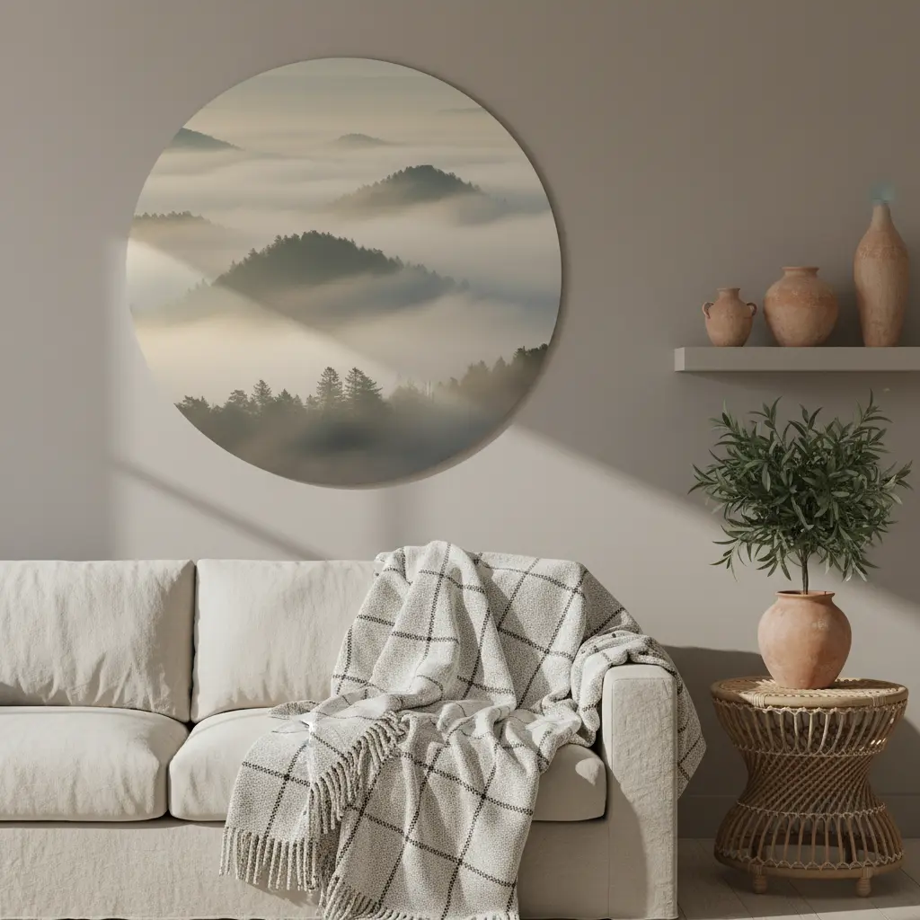 Mistige bergtoppen omhuld door zachte ochtendmist, met subtiele bomen die door de nevel schijnen. De warme grijze en crème tinten met salie-groene accenten creëren een serene, rustgevende sfeer die perfect past in een boho of minimalistisch interieur met linnen, rotan en keramiek.