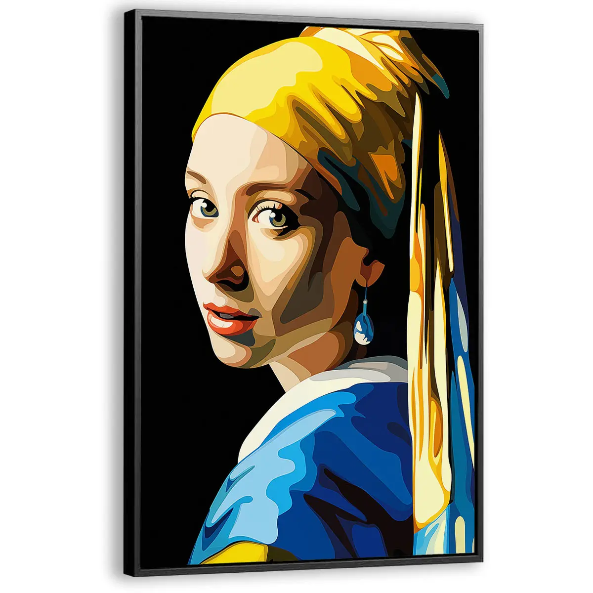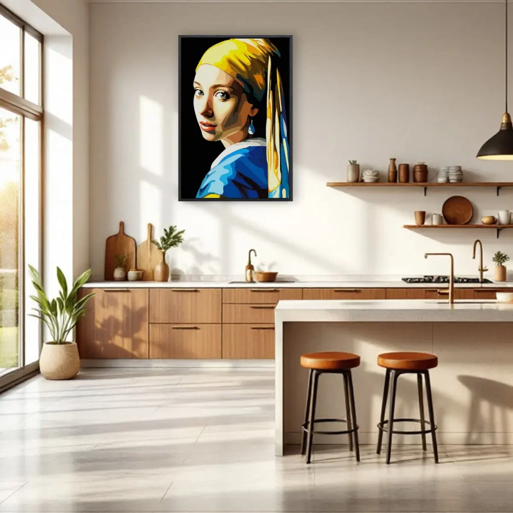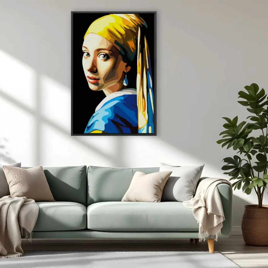 Een eigentijdse pop art versie van het klassieke "Meisje met de Parel" in heldere, geometrische kleuren. De combinatie van geel, blauw en warme huidtinten geeft dit iconische kunstwerk een frisse, moderne twist. Als wanddecoratie brengt deze print een perfecte balans tussen klassieke kunst en hedendaagse stijl, ideaal voor kunstliefhebbers die houden van moderne interpretaties van tijdloze meesterwerken.