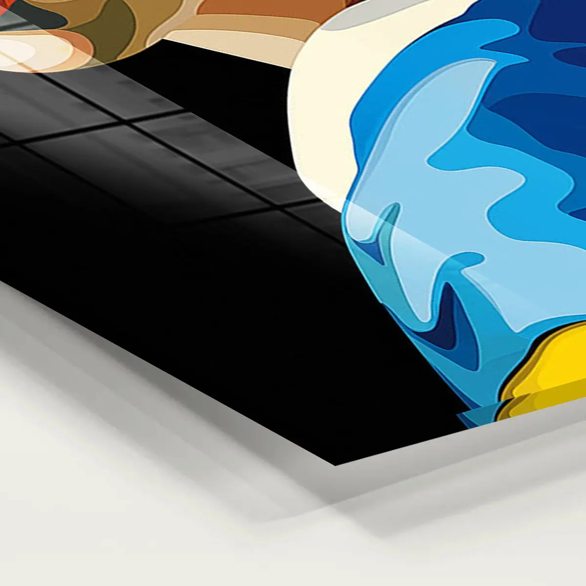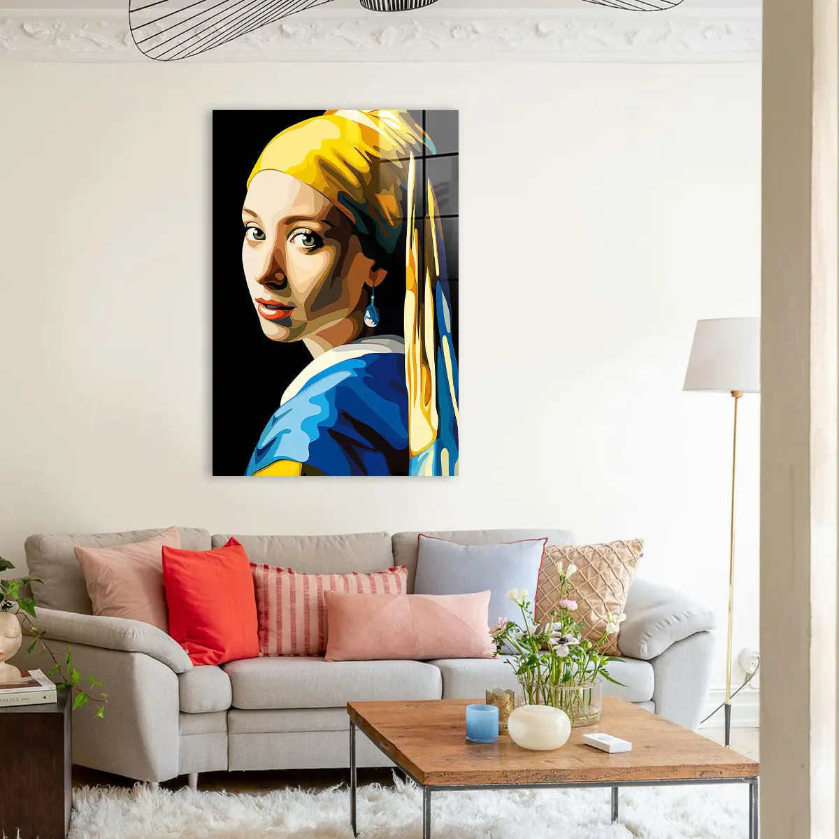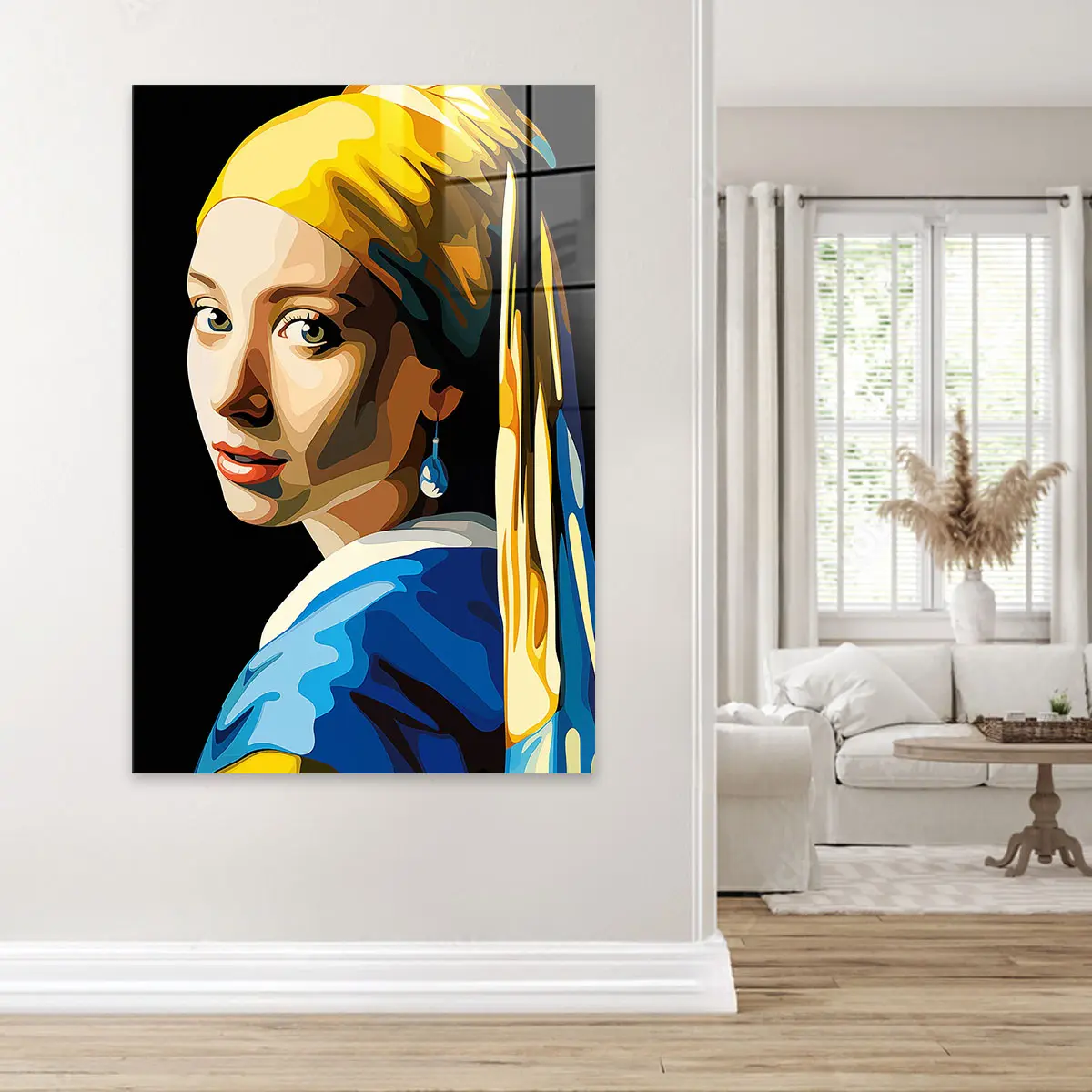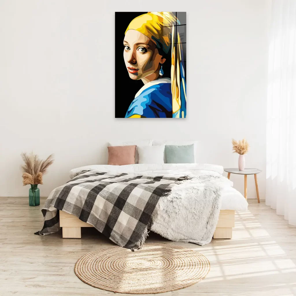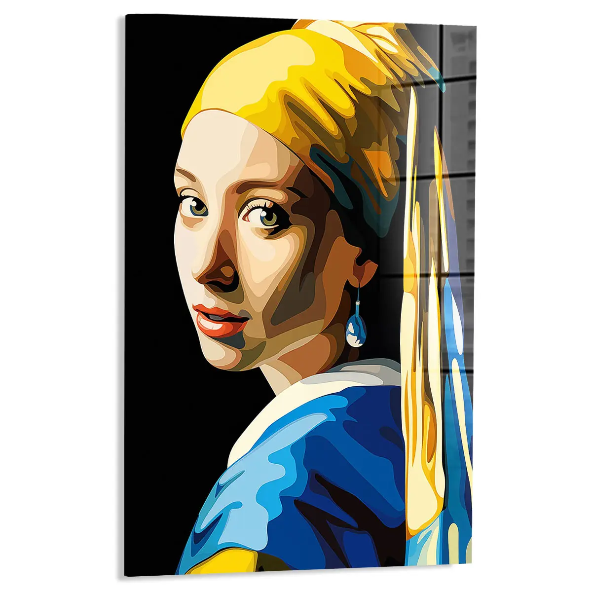 Een eigentijdse pop art versie van het klassieke "Meisje met de Parel" in heldere, geometrische kleuren. De combinatie van geel, blauw en warme huidtinten geeft dit iconische kunstwerk een frisse, moderne twist. Als wanddecoratie brengt deze print een perfecte balans tussen klassieke kunst en hedendaagse stijl, ideaal voor kunstliefhebbers die houden van moderne interpretaties van tijdloze meesterwerken.