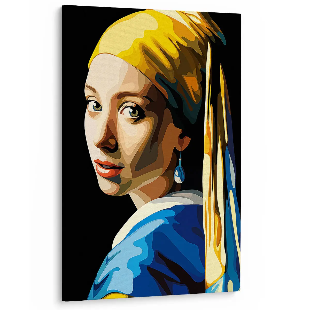 Een eigentijdse pop art versie van het klassieke “Meisje met de Parel” in heldere, geometrische kleuren. De combinatie van geel, blauw en warme huidtinten geeft dit iconische kunstwerk een frisse, moderne twist. Als wanddecoratie brengt deze print een perfecte balans tussen klassieke kunst en hedendaagse stijl, ideaal voor kunstliefhebbers die houden van moderne interpretaties van tijdloze meesterwerken.
