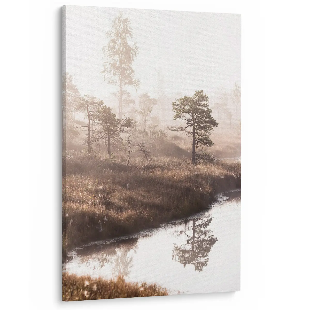 Een dromerig landschap waar dennenbomen zich spiegelen in stil water, gehuld in zachte ochtendmist. De warme zonnestralen die door de mist schijnen creëren een magisch moment. Deze wanddecoratie brengt de serene rust van een vroege ochtend in de natuur naar binnen.