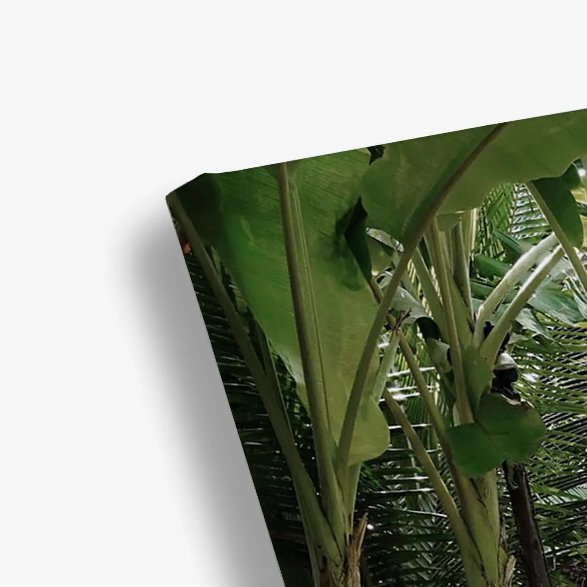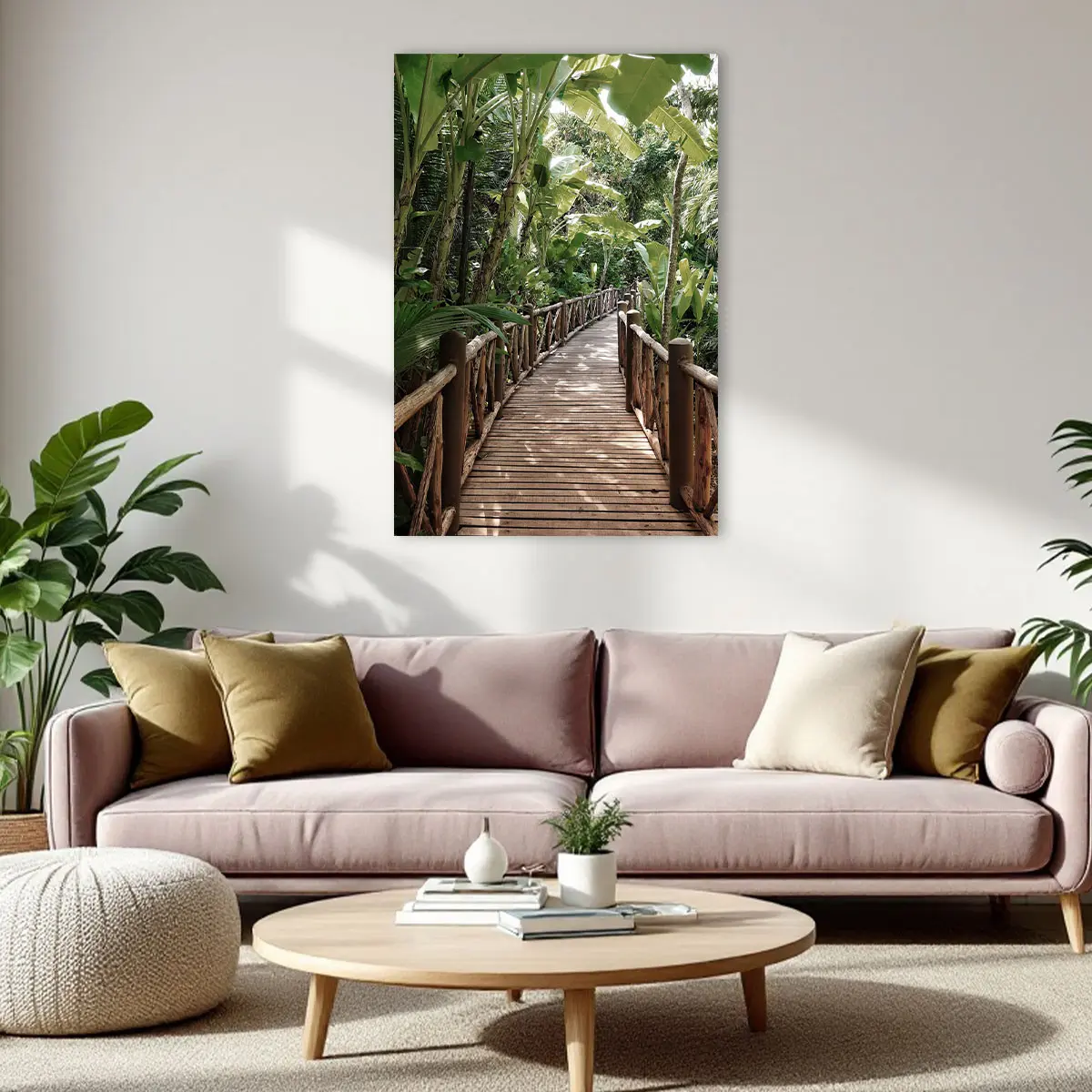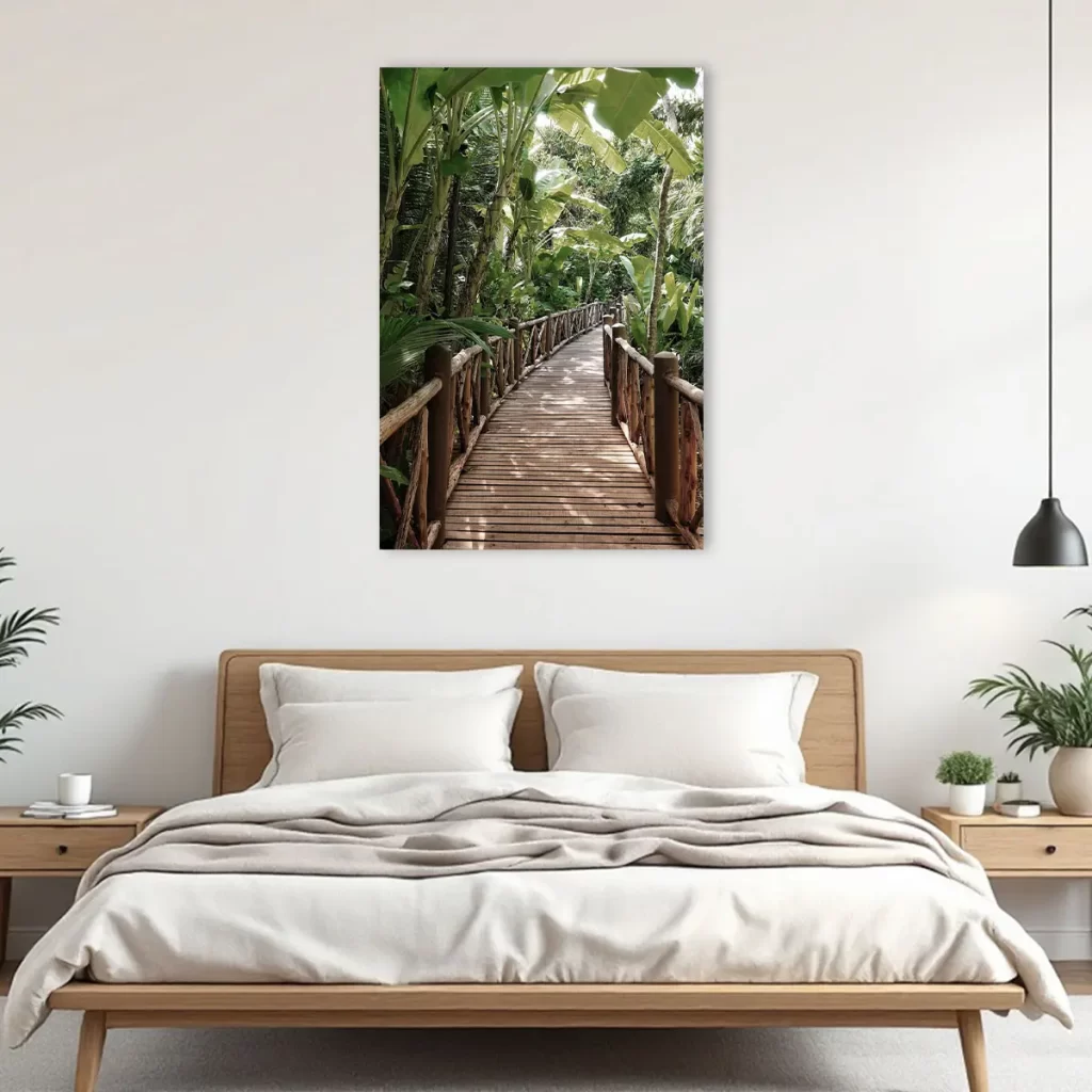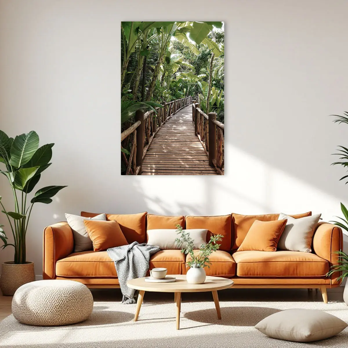 Een uitnodigende houten brug die zich door een weelderige tropische jungle slingert. De rijke groentinten van de palmbladeren en bananenbomen creëren een natuurlijk baldakijn, terwijl het houten pad een gevoel van avontuur en ontdekkingsreis oproept. Als wanddecoratie brengt deze print een vleugje exotische rust en natuurlijke schoonheid in elk interieur, perfect voor een tropisch of natuurlijk geïnspireerd thema.