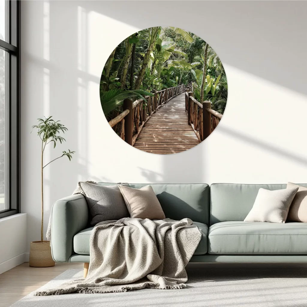 Een uitnodigende houten brug die zich door een weelderige tropische jungle slingert. De rijke groentinten van de palmbladeren en bananenbomen creëren een natuurlijk baldakijn, terwijl het houten pad een gevoel van avontuur en ontdekkingsreis oproept. Als wanddecoratie brengt deze print een vleugje exotische rust en natuurlijke schoonheid in elk interieur, perfect voor een tropisch of natuurlijk geïnspireerd thema.