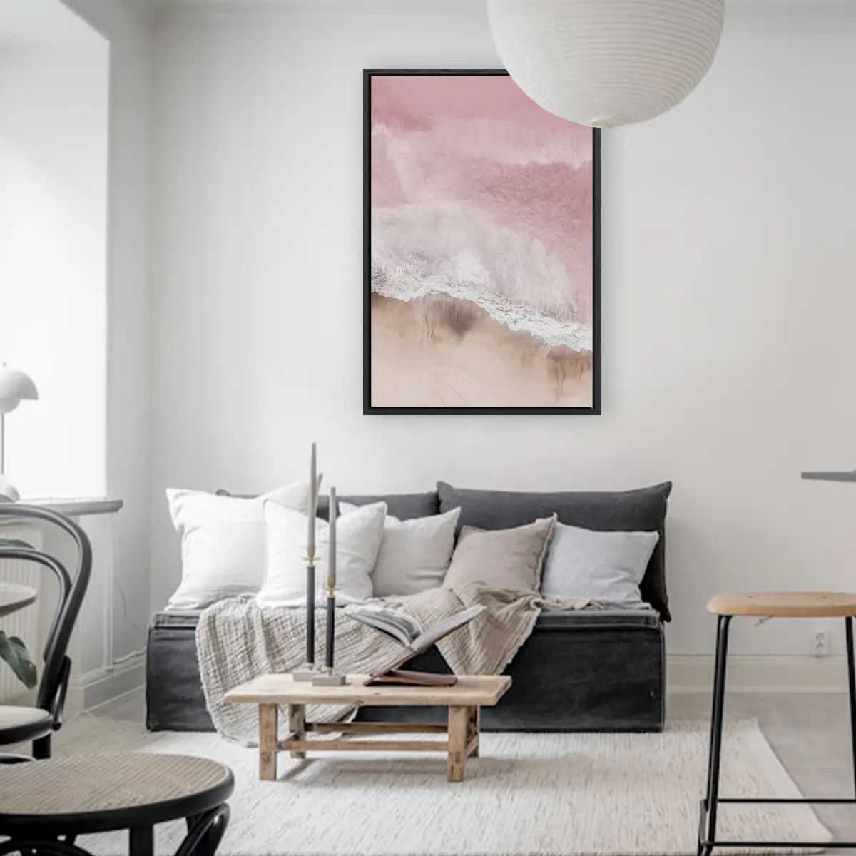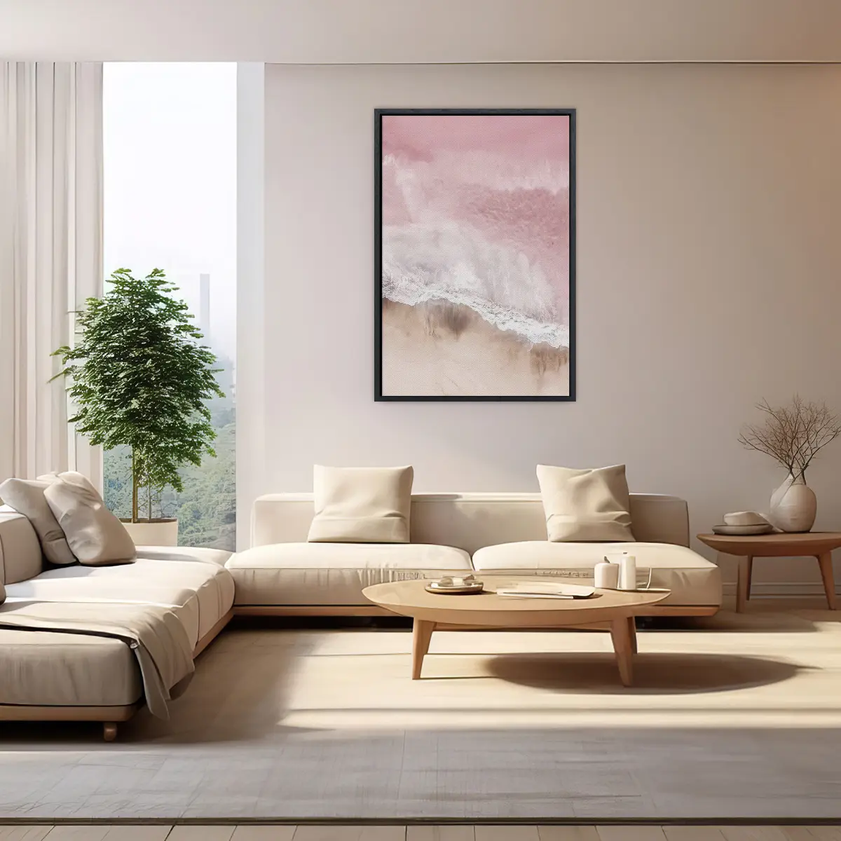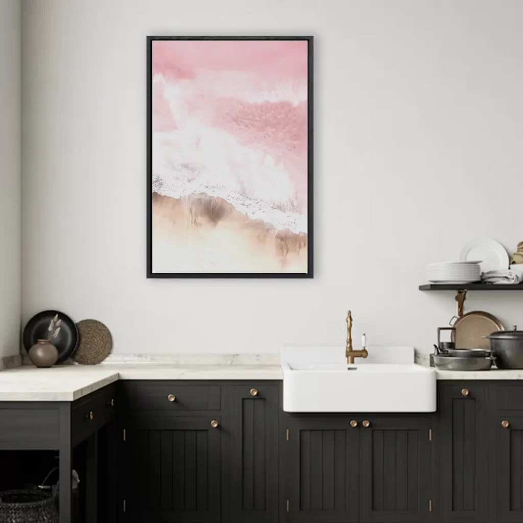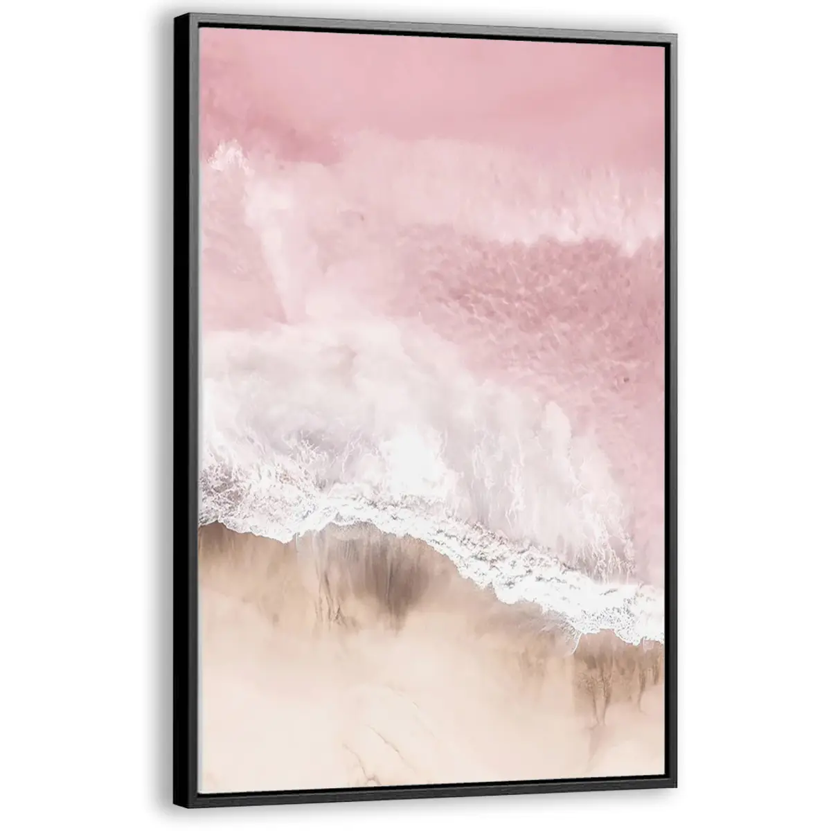 Een serene luchtfoto van waar oceaan en strand samenkomen, gedompeld in zachte roze tinten. Deze abstracte natuurfotografie creëert een kalmerend effect en voegt een vleugje romantische elegantie toe aan elk interieur.