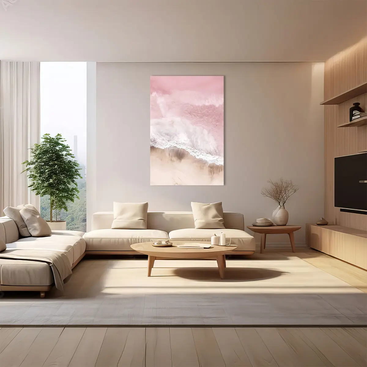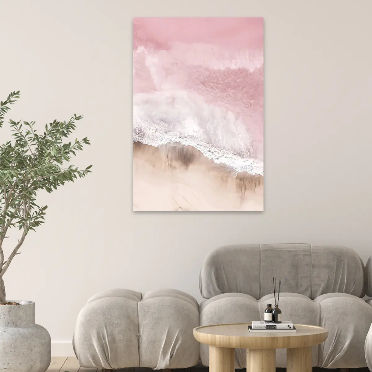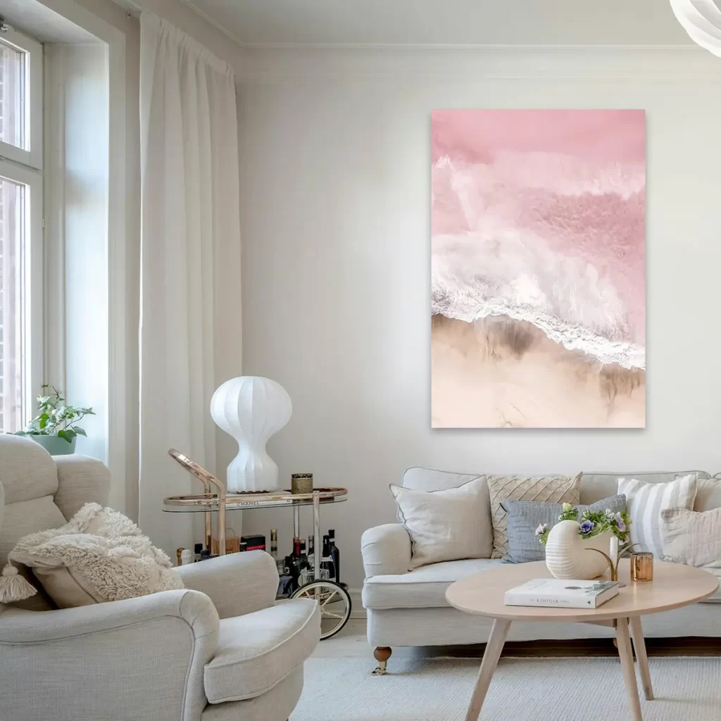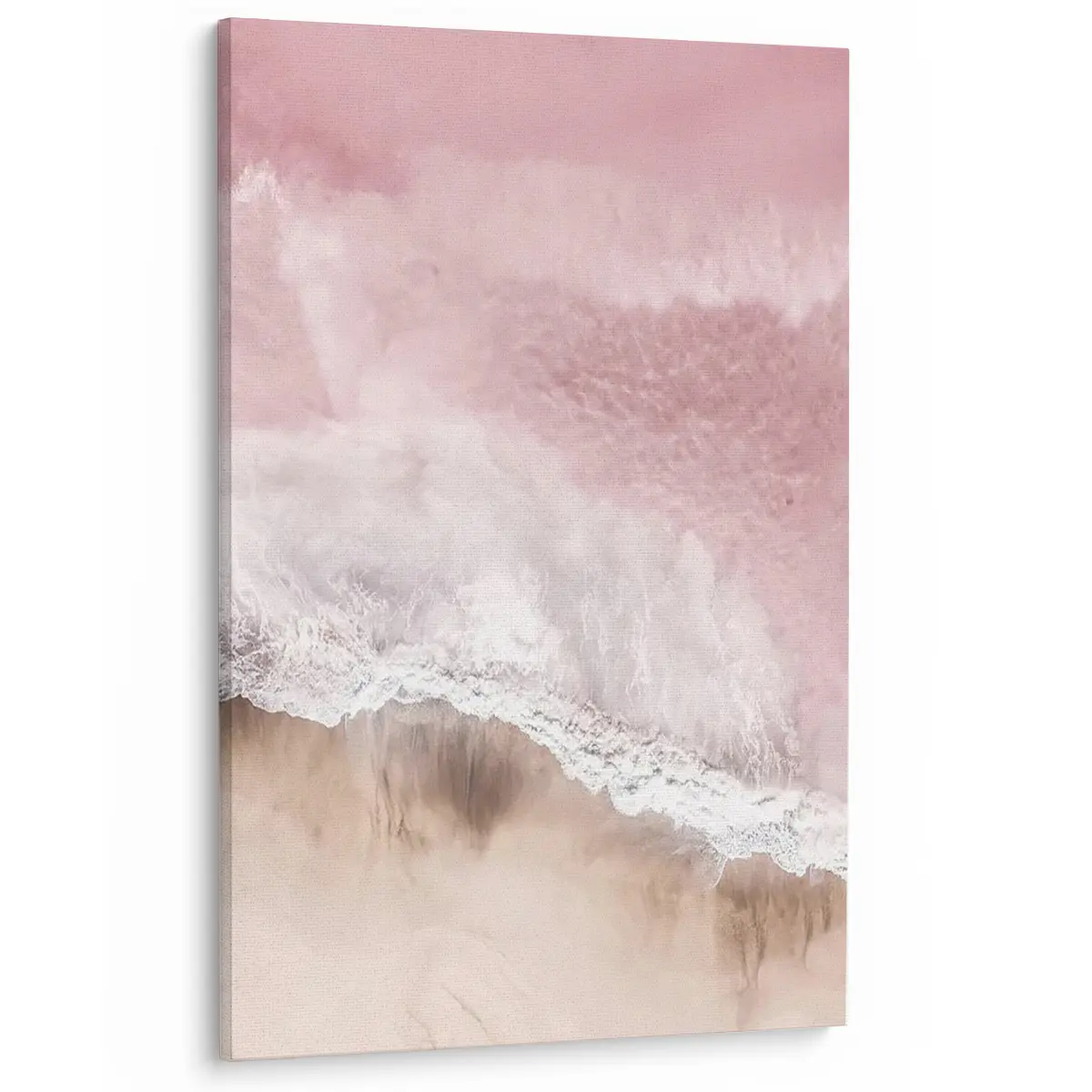 Een serene luchtfoto van waar oceaan en strand samenkomen, gedompeld in zachte roze tinten. Deze abstracte natuurfotografie creëert een kalmerend effect en voegt een vleugje romantische elegantie toe aan elk interieur.