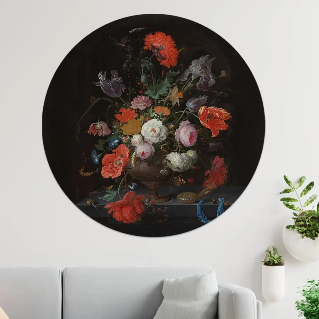 Stilleven met bloemen en een horloge. Op een stenen plint ligt een gouden horloge met blauw lint naast een boeket bloemen (tulpen, rozen, papavers, anemonen, narcissen en irissen) in een vaas. Tussen de bloemen en op de plint bevinden zich slakken, rupsen, een hommel en een libel.