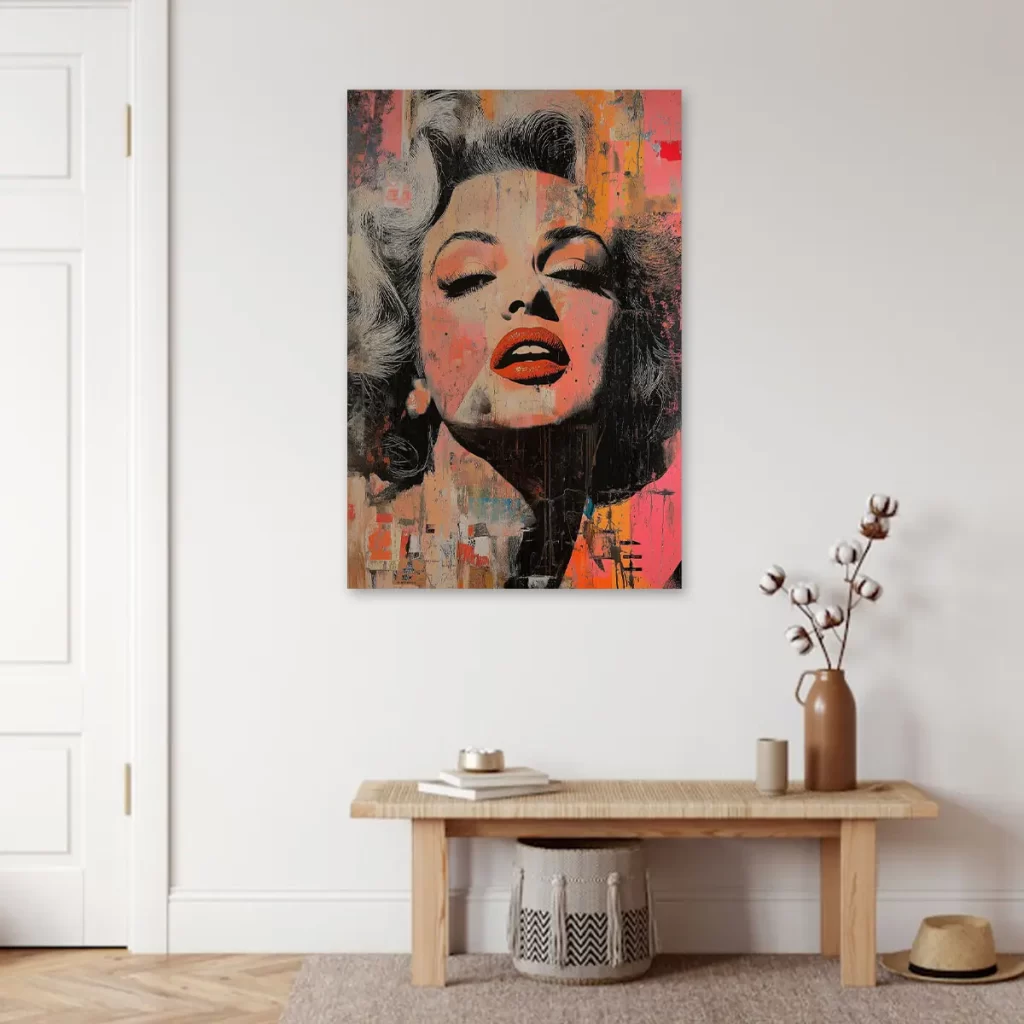 Een expressieve street art interpretatie van een Marilyn Monroe portret met opvallende rode lippen en verweerde texturen. De warme oranje en roze tinten gecombineerd met de ruwe, artistieke afwerking creëren een krachtig en emotioneel kunstwerk. Deze print brengt een vleugje urbane kunst en moderne expressie in huis, ideaal voor een eigentijds of industrieel interieur.
